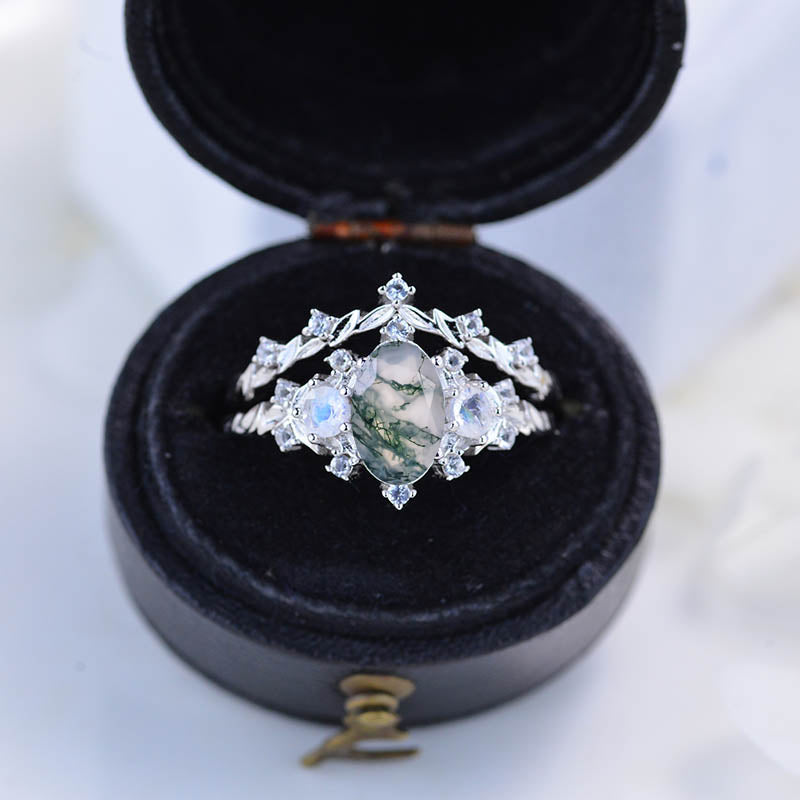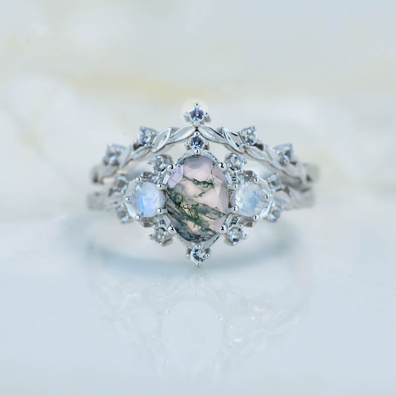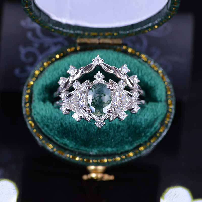 1 Carat Oval Genuine Moss Agate Halo 14K White Gold Floral Engagement Ring Set Model 766-7x5