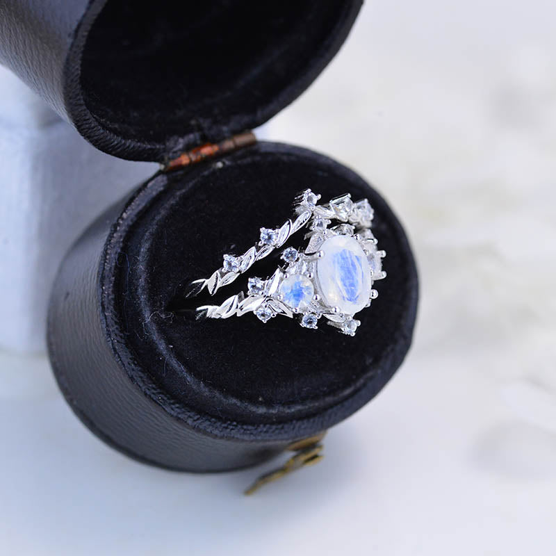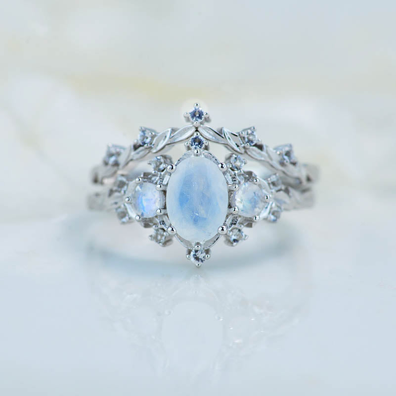 1 Carat Oval Moonstone Halo 14K White Gold Floral Engagement Ring Set - Giliarto