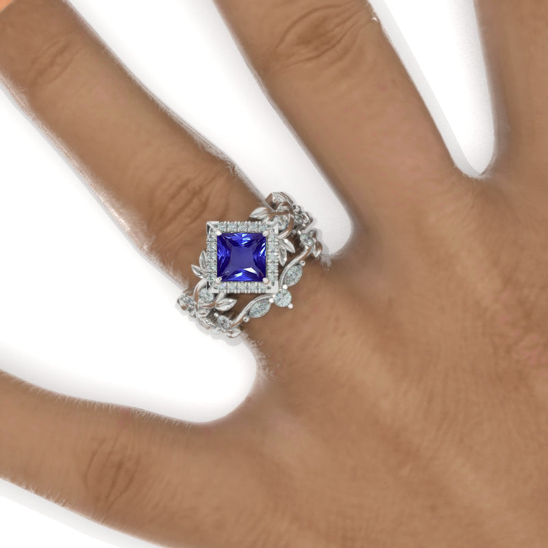 1 Carat Princess Cut Natural Genuine Tanzanite Halo Floral Twig Orname - Giliarto