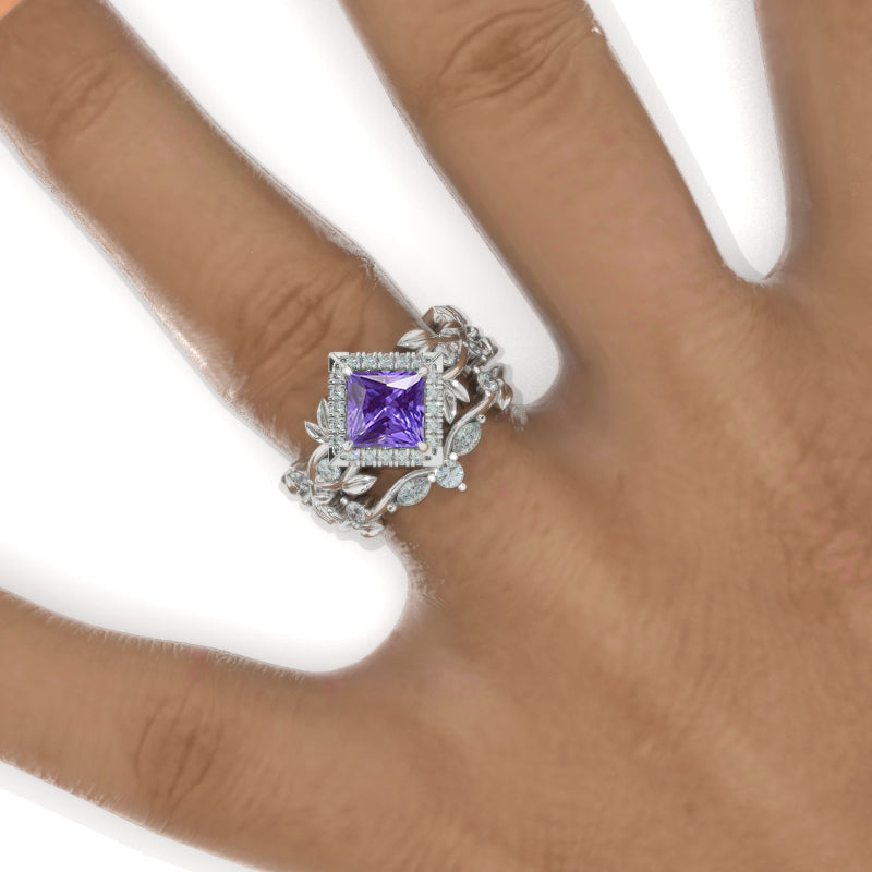 1 Carat Princess Cut Purple Sapphire Halo Floral Twig Ornamental Engagement 14K White Gold Ring Eternity Ring Set