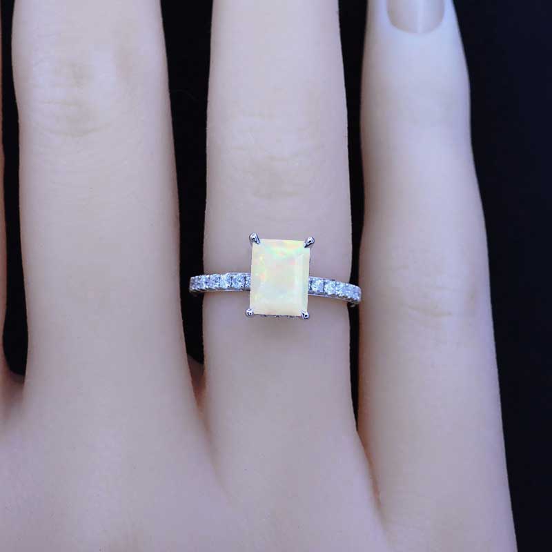 The design features approximately 1 Carat Genuine White Opal- Radiant 7x5mm D-Colorless, VVS1-Clarity,VG-Cut,Ex-Polish, VG-Symmetry Center Stone, 0.5 CTW D- Colorless Moissanite Accents Stones