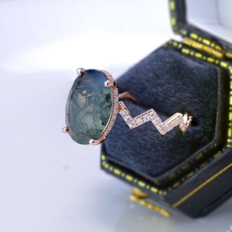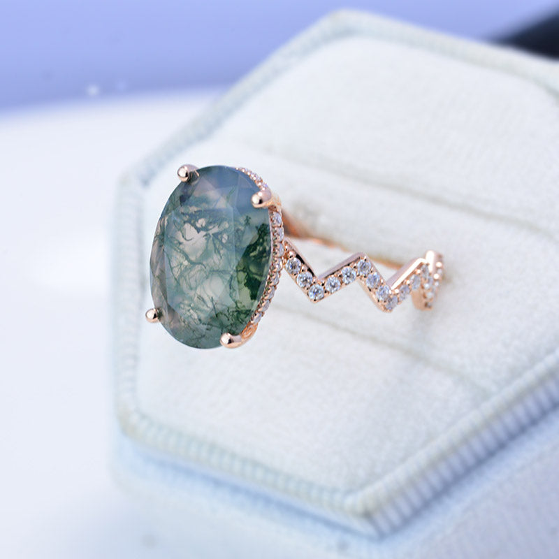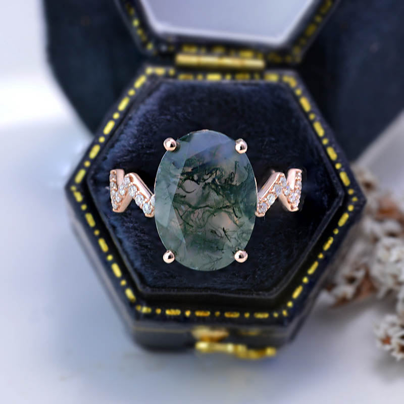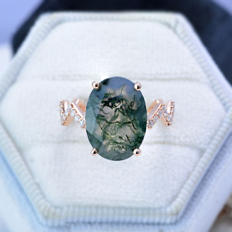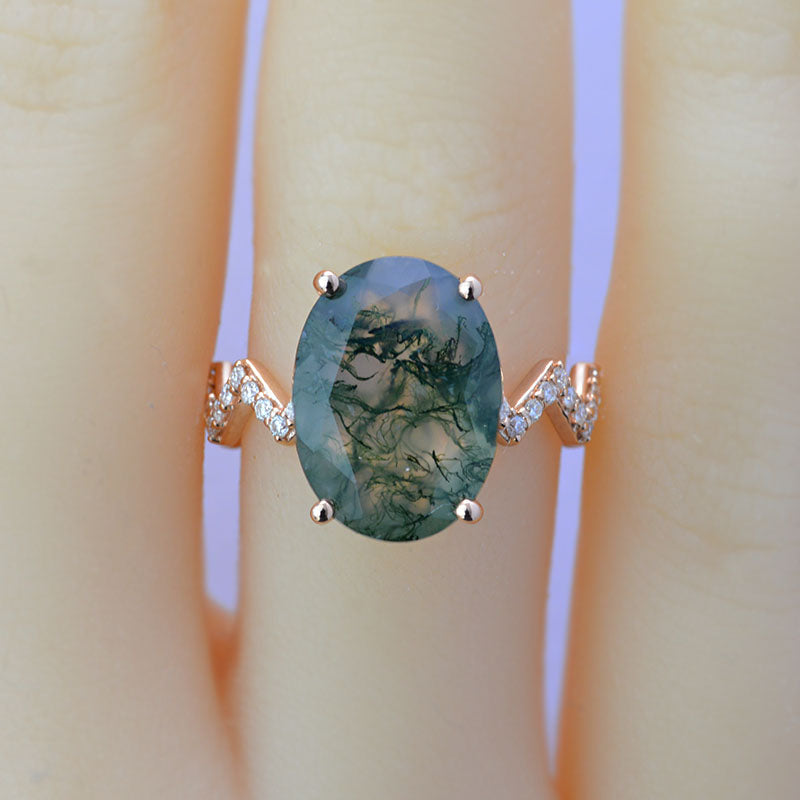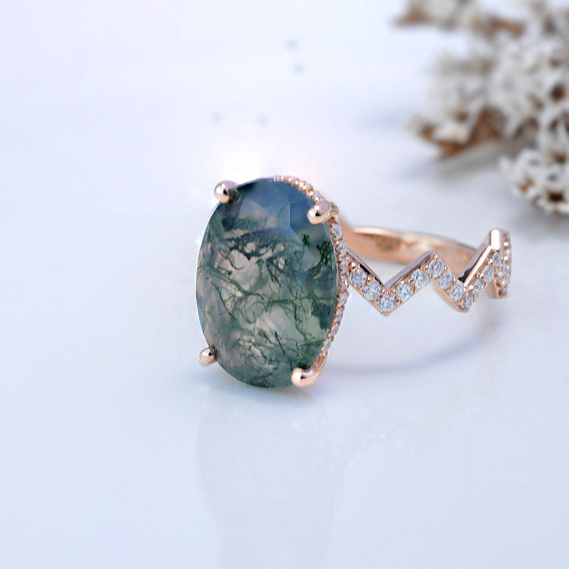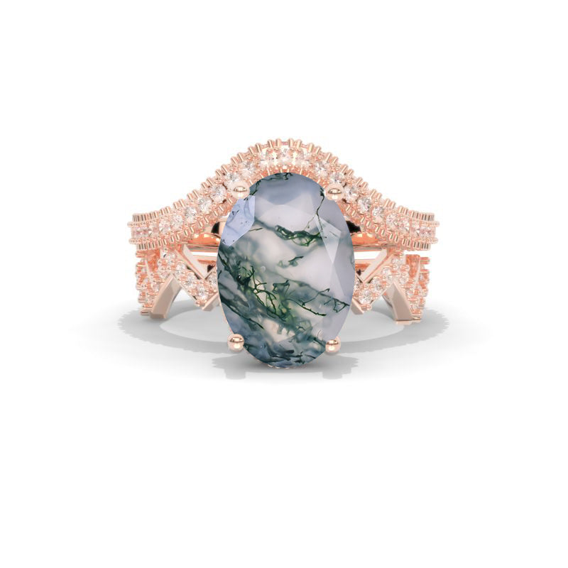 The default design option features 10 Carat Oval Cut 14x10mm Moss Agate Center Stone VG-Cut, Ex-Polish, VG-Symmetry, Set With D-Colorless Accent Stones 0.3 CTW Moissanite Accents Stones