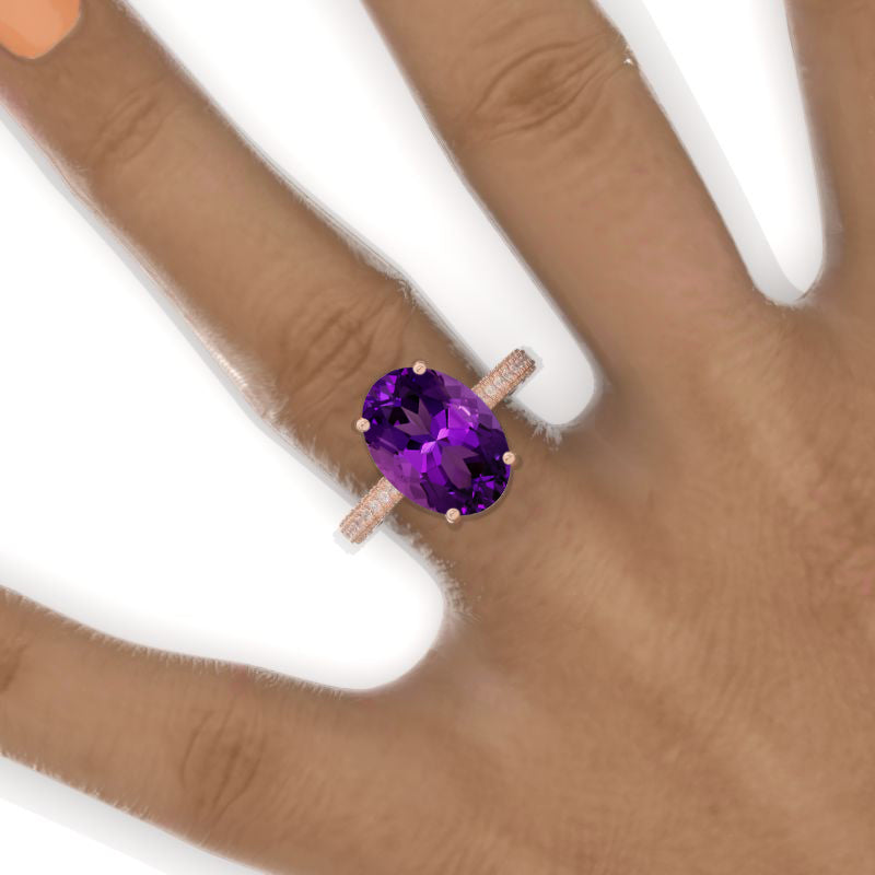 The default design option features 10 Carat Oval Cut 14x10mm Genuine Natural Amethyst- AAAA GradeCenter Stone VG-Cut, Ex-Polish, VG-Symmetry, Set With 148-Accent Stones 0.37 CTW