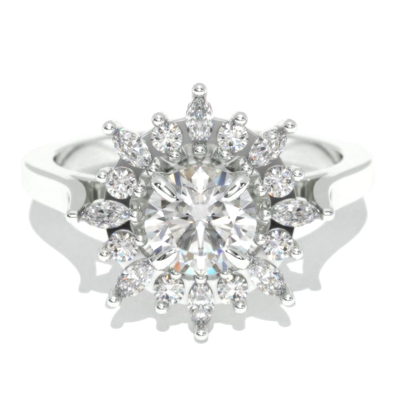 1.25 Carat Moissanite Round  5.5mm D-Colorless, VSS1-Clarity, VG-Cut, Ex-Polish, VG-Symmetry Center Stone with 16 - 0.35 CTW (D-Colorless, VVS1 clarity) Accent Stones 14K White Gold Ring.