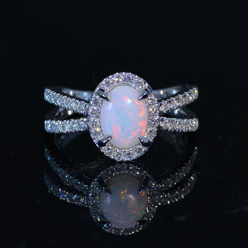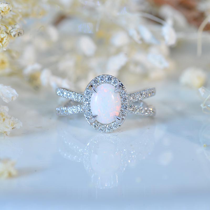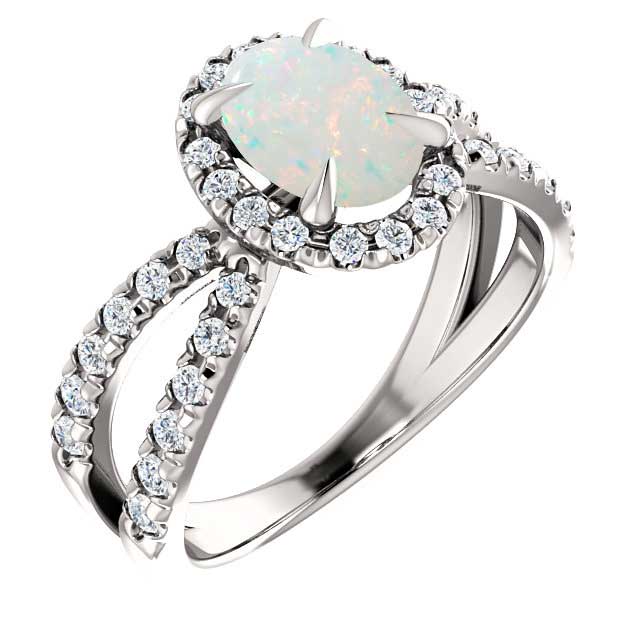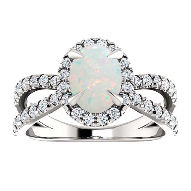 10K White Gold 1.25 Carat Oval White Opal Diamond Halo French-Set Engagement Ring
