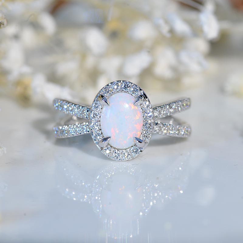 10K White Gold 1.25 Carat Oval White Opal Diamond Halo French-Set Enga - Giliarto