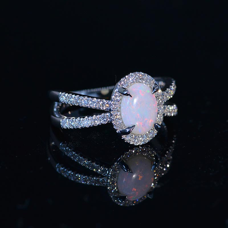 1.25 Carat Natural White Opal 8x6mm Oval Center Stone with 40 Natural 0.4 CTW Diamond (D-Color, VVS1 clarity) French-Set Accent Stones 10K White  Gold  Ring.