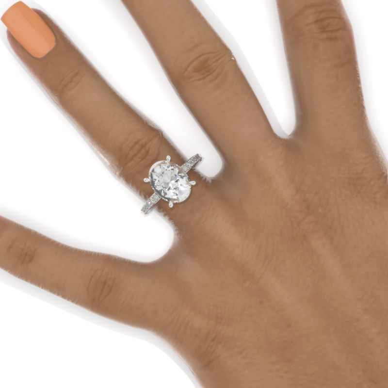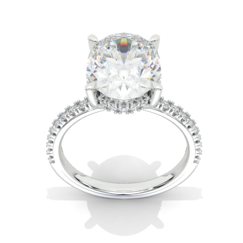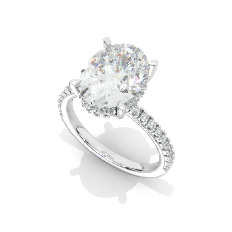 The default design option features 12x9 Oval LAB-Grown Diamond Center Stone D-Colorless VVS1-Clarity, VG-Cut, Ex-Polish, VG-Symmetry set with D- Colorless LAB-Grown Diamond Accent Stones