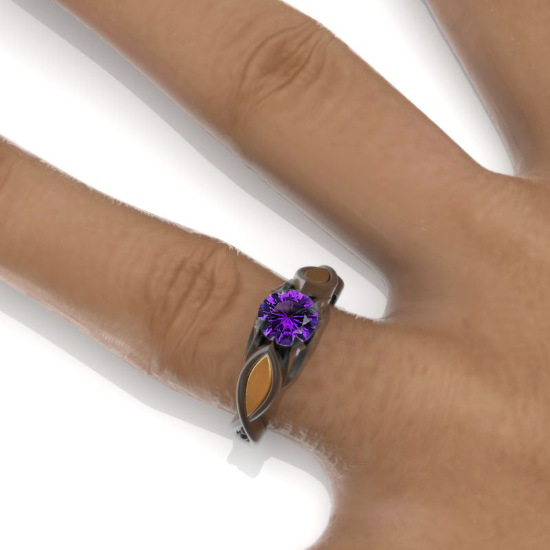 Genuine Natural Amethyst- AAAA Grade Center Stone - Round 6mm, Ex-Cut, Ex-Polish, VG-Symmetry) and Yellow Gold Inserts in 14K Black Gold or Black Platinum.