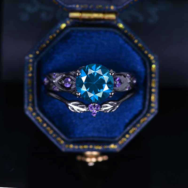 Ethically Lab-Grown Cornflower Sapphire Center Stone - Round 8 mm, Genuine, VVS1-Clarity, Ex-Cut, Ex-Polish, VG-Symmetry) and 8-Accents  0.1 CTW with 14K Black Gold or Black Platinum. Black Rhodium Plated.