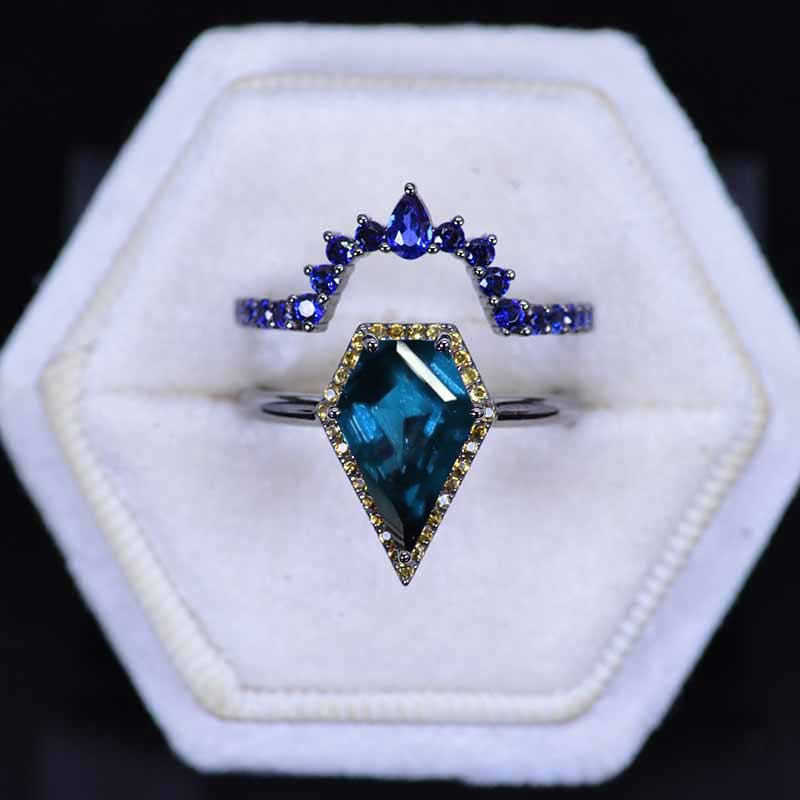 14K Black Gold 3 Carat Kite Cornflower Sapphire Halo Engagement Ring, Rings Set