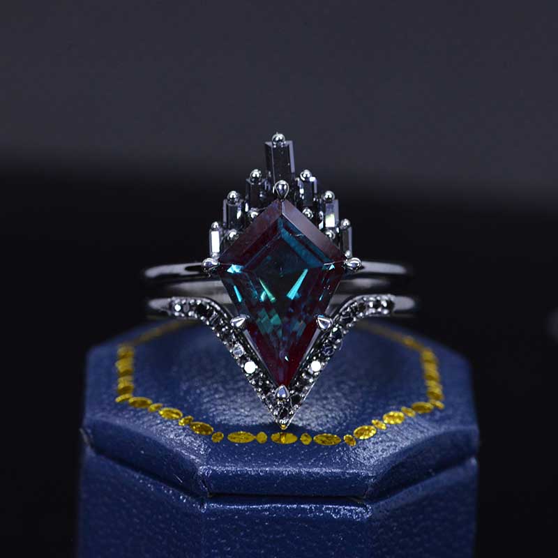 14K Black Gold 4 Carat Kite Alexandrite Diamond Halo Engagement Ring, Eternity Ring Set