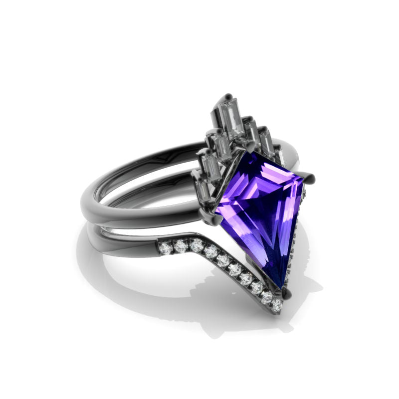 14K Black Gold 4 Carat Kite Natural Amethyst Halo Engagement Ring, Eternity Ring Set