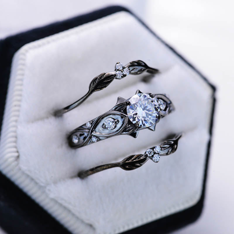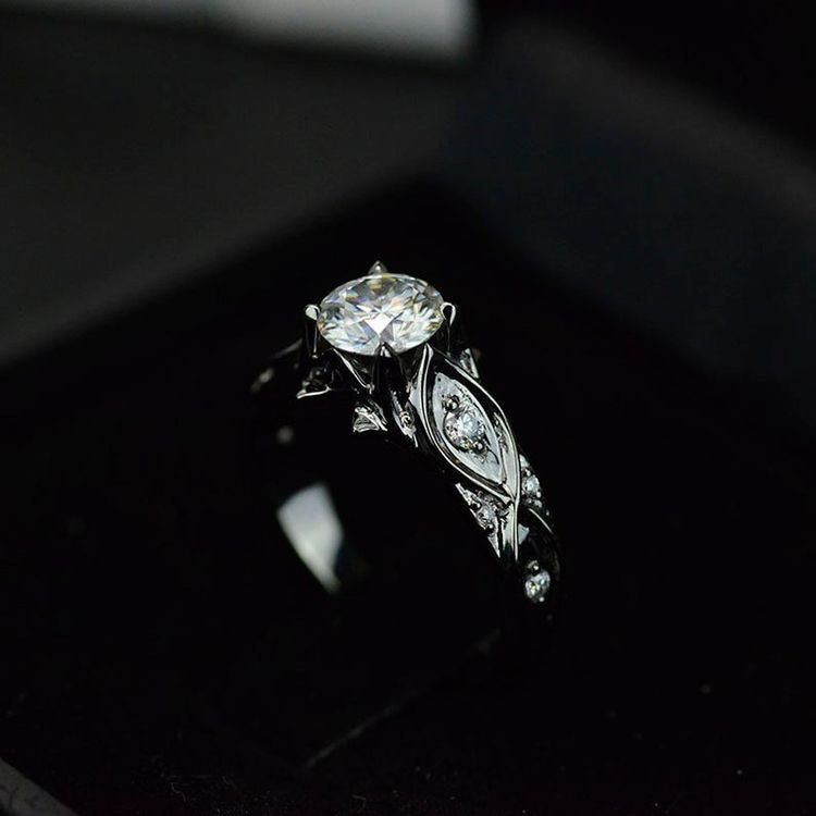 Moissanite Center Stone - Round 7mm, D-Colorless, VVS1-Clarity, Ex-Cut, Ex-Polish, VG-Symmetry and 8 D-Colorless Accents 0.1 CTW with 14K Black Gold or Black Platinum. Black Rhodium.