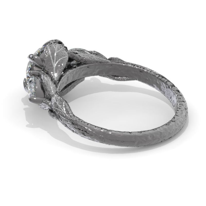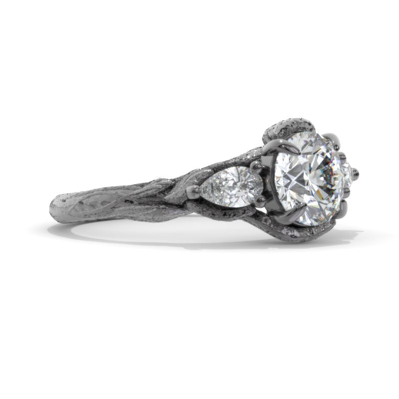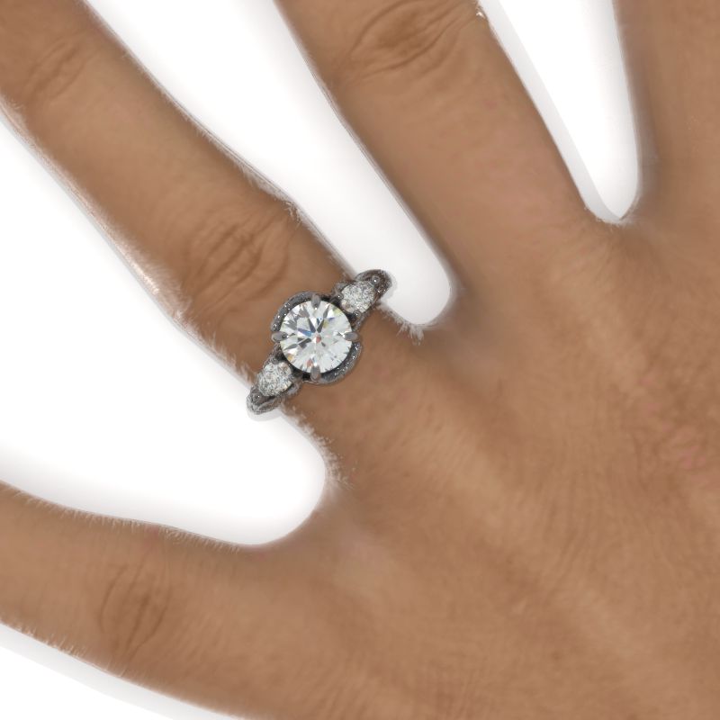 Moissanite Center Stone - Round 7mm, D-Colorless, VVS1-Clarity, Ex-Cut, Ex-Polish, VG-Symmetry and 8 D-Colorless Accents 0.1 CTW with 14K Black Gold or Black Platinum. Black Rhodium.