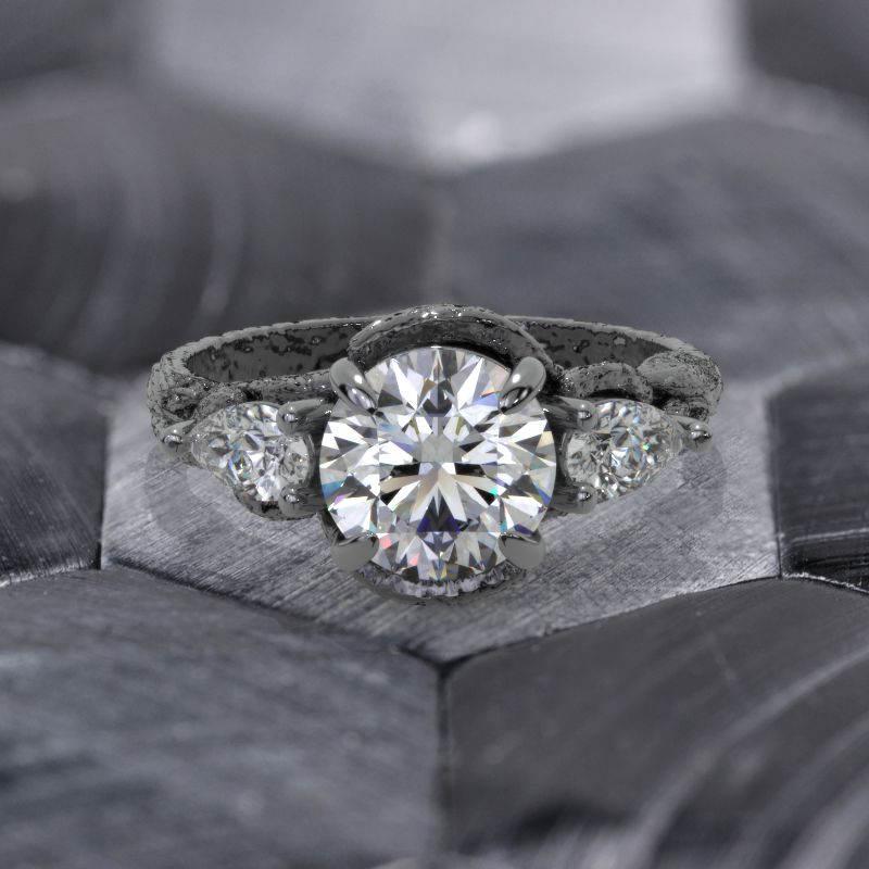 Moissanite Center Stone - Round 7mm, D-Colorless, VVS1-Clarity, Ex-Cut, Ex-Polish, VG-Symmetry and 8 D-Colorless Accents  0.1 CTW with 14K Black Gold or Black Platinum. Black Rhodium.