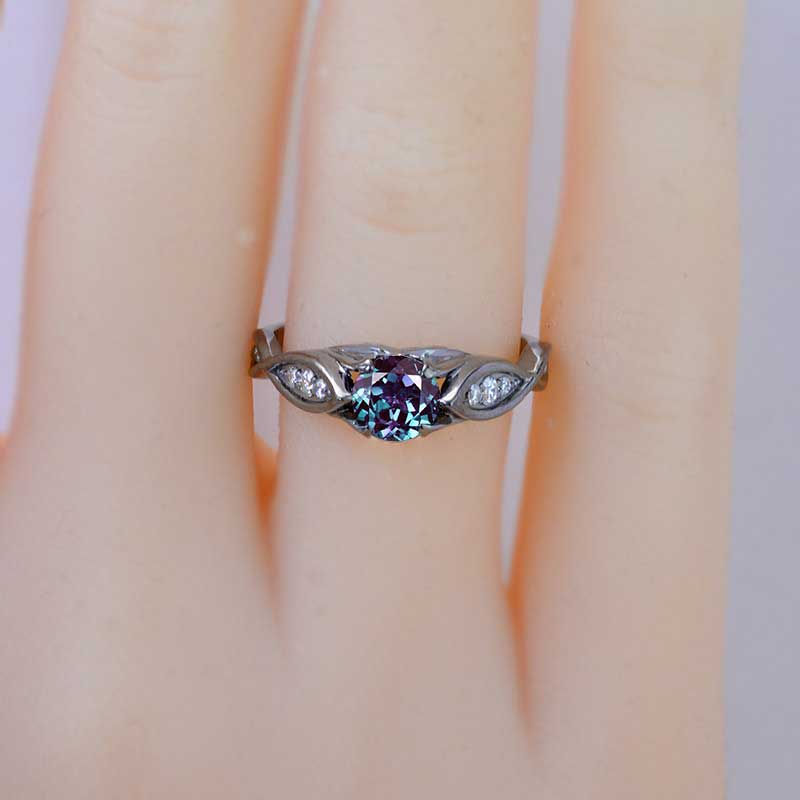 Ethically Lab-Grown Alexandrite Center Stone-Round 6 mm, Ex-Cut, Ex-Polish, VG-Symmetry) and 8-Moissanite Accents 0.1 CTW with 14K Black Gold or Black Platinum.