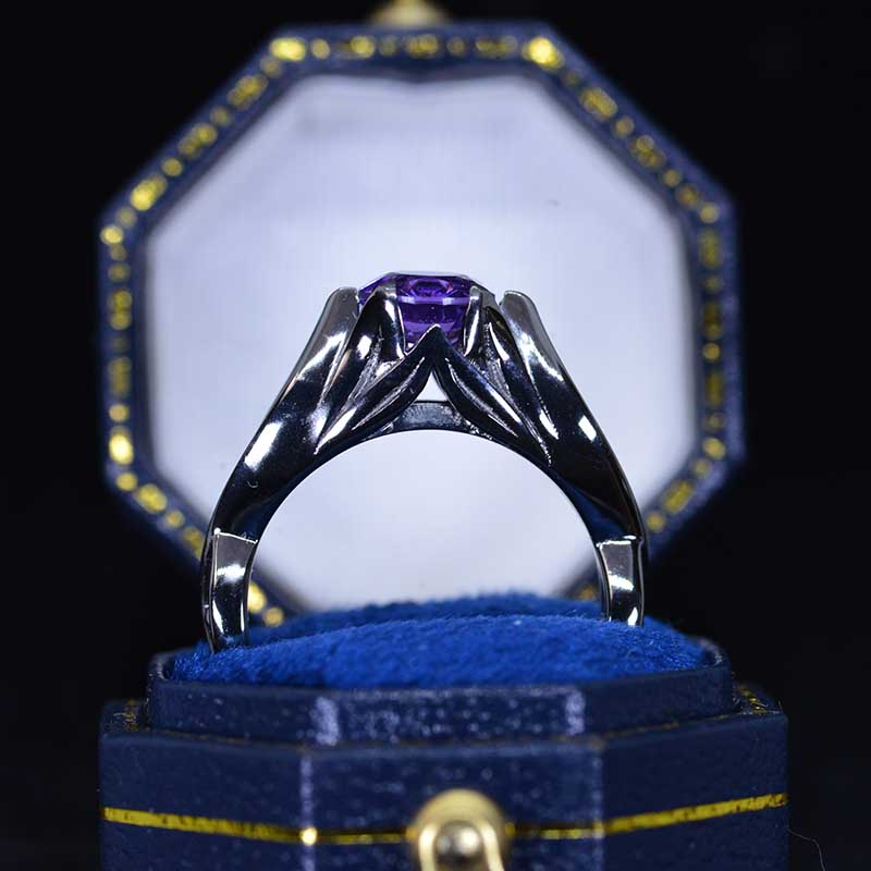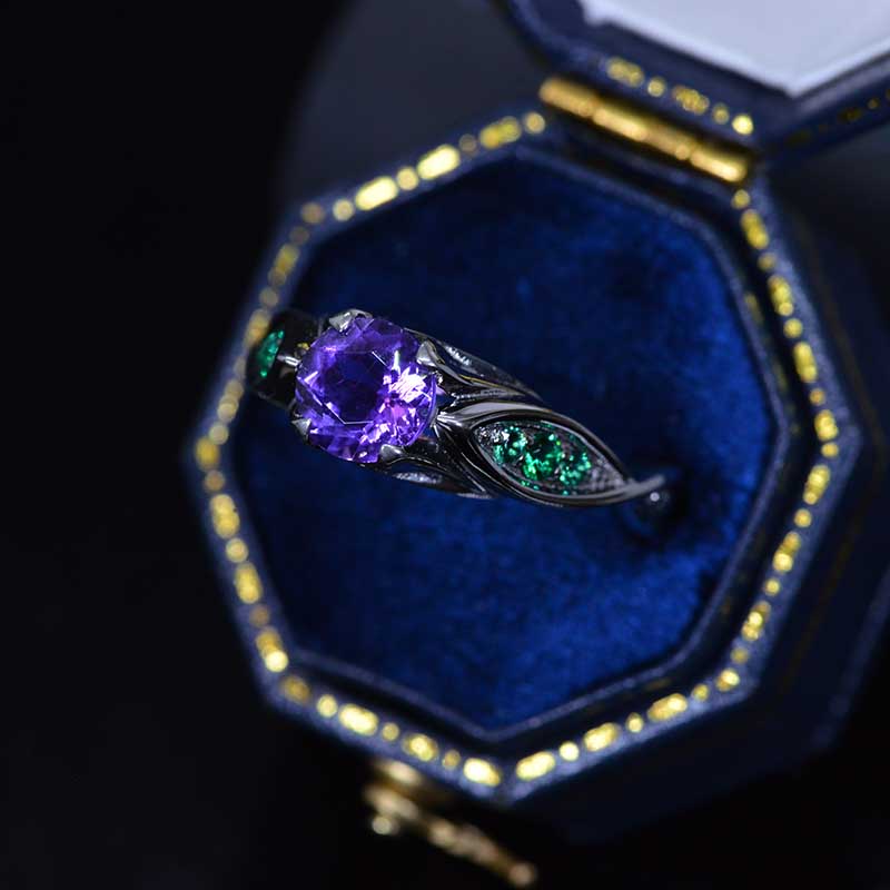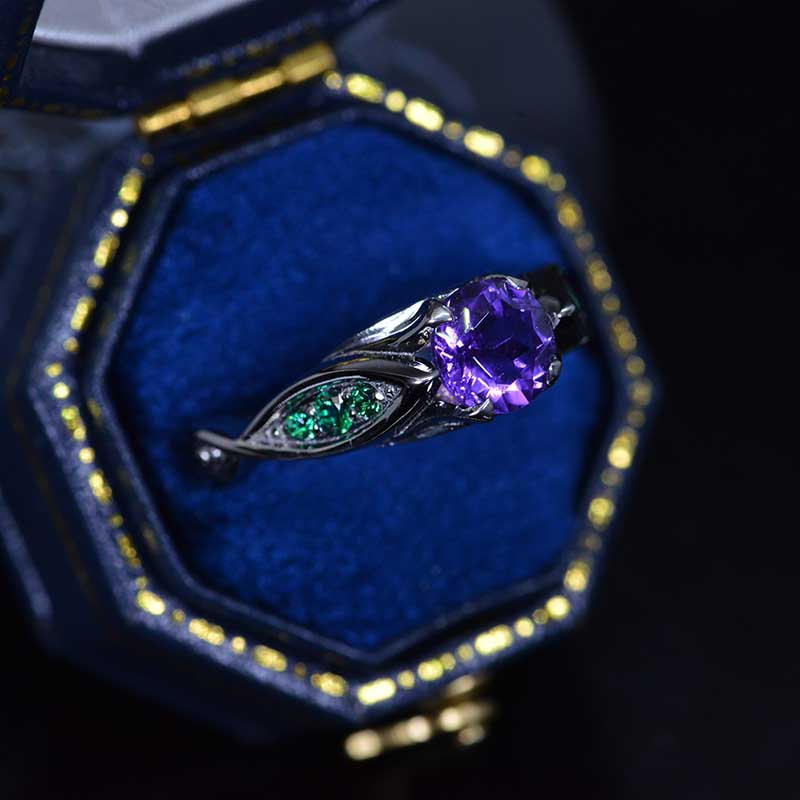 Amethyst  Center Stone-Round 6 mm, Ex-Cut, Ex-Polish, VG-Symmetry) and 8-Emerald Accents  0.1 CTW with 14K Black Gold or Black Platinum.