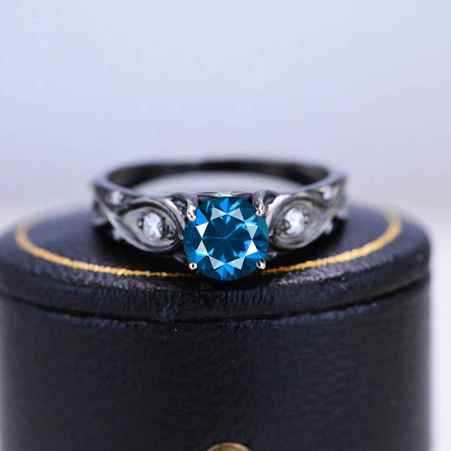 Ethically Lab-Grown Cornflower Sapphire Center Stone - Round 6 mm, Ex-Cut, Ex-Polish, VG-Symmetry) and 8 - Colorless  Moissanites Accents  0.1 CTW with 14K Black Gold or Black Platinum.