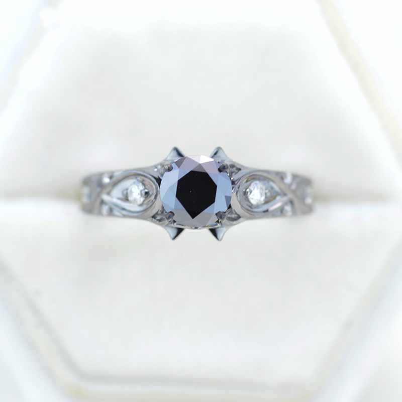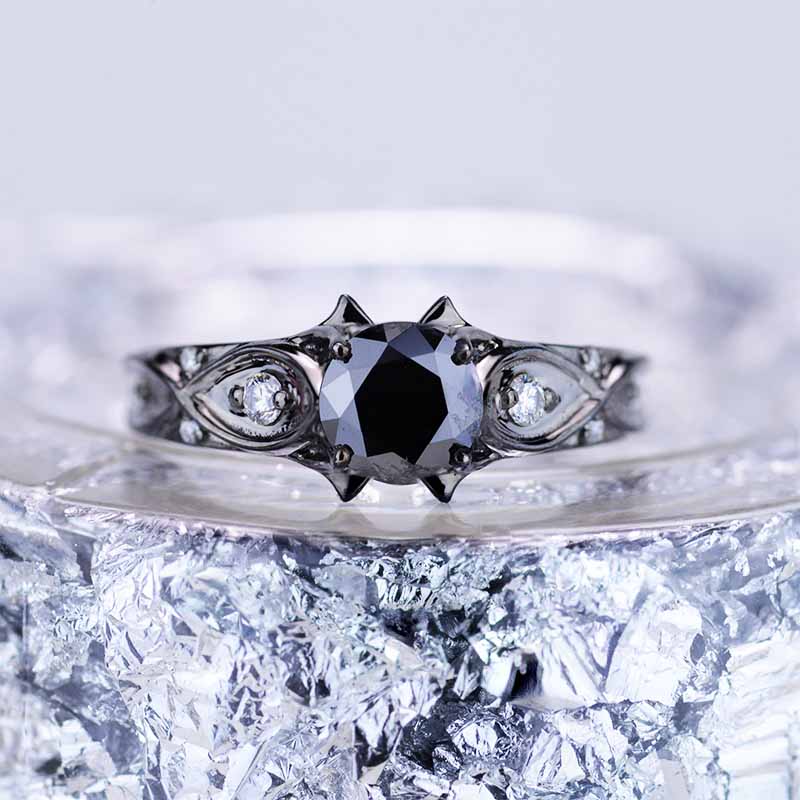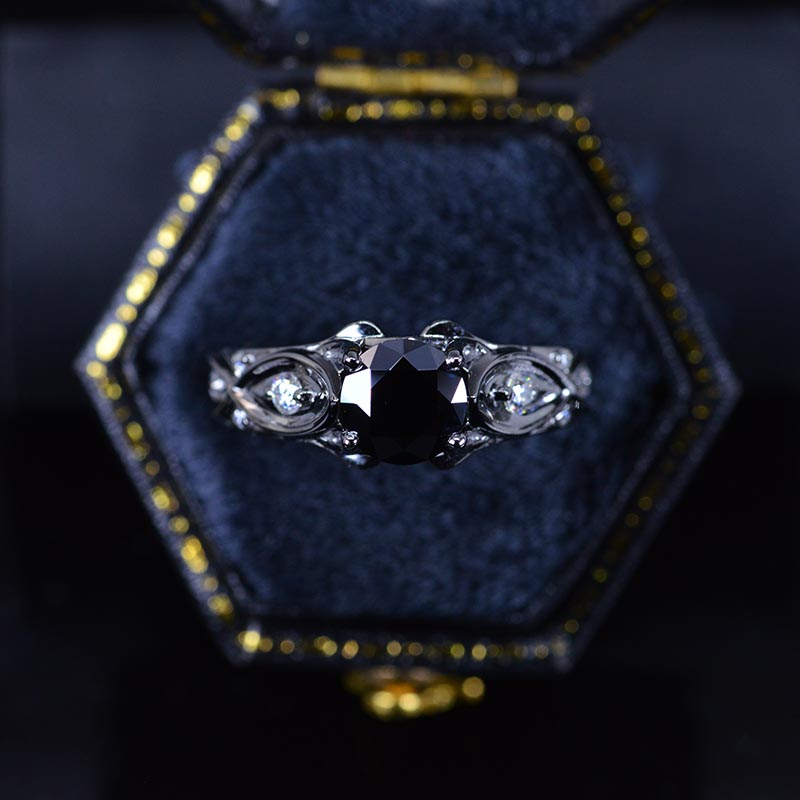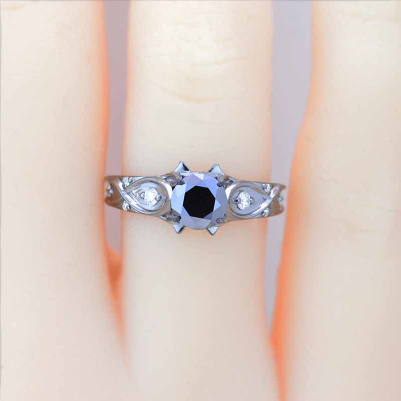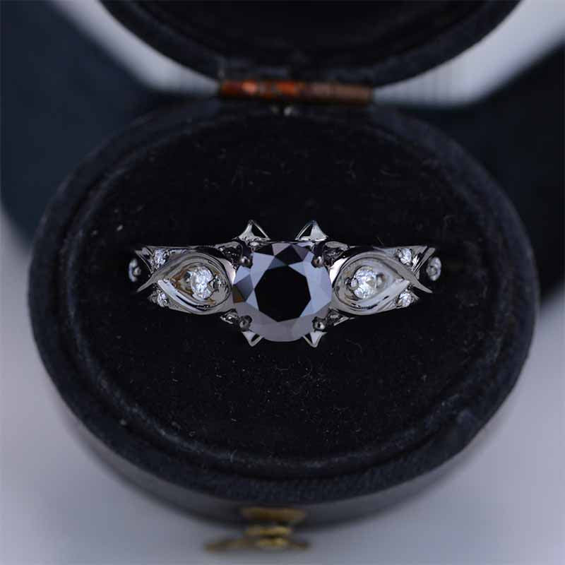 Black Moissanite Center Stone - Round 6 mm,  Ex-Cut, Ex-Polish, VG-Symmetry and 8 - D- Colorless Accents  0.1 CTW with 14K Black Gold or Black Platinum.