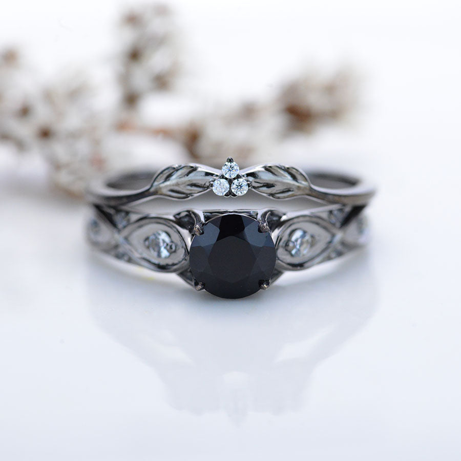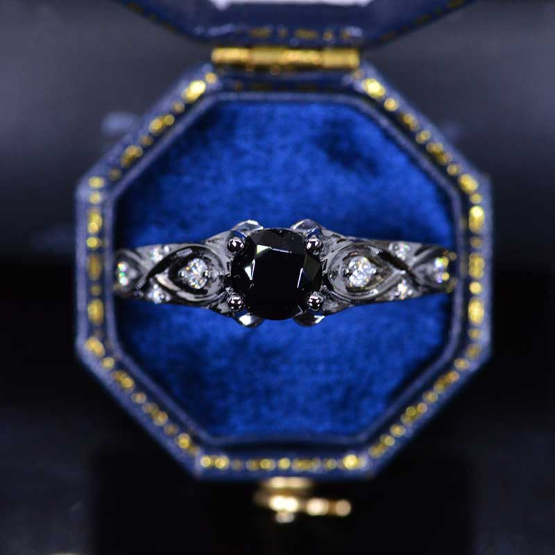 Black Moissanite Center Stone - Round 6 mm, Ex-Cut, Ex-Polish, VG-Symmetry) and 8 - Colorless  Moissanites Accents  0.1 CTW with 14K Black Gold or Black Platinum.