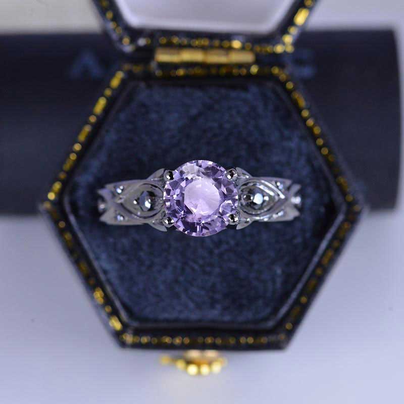 Ethically Lab-Grown Purple Sapphire Center Stone - Round 6 mm, Ex-Cut, Ex-Polish, VG-Symmetry and 8 - Black Accents 0.1 CTW with 14K Black Gold or Black Platinum. Black Rhodium Plated.