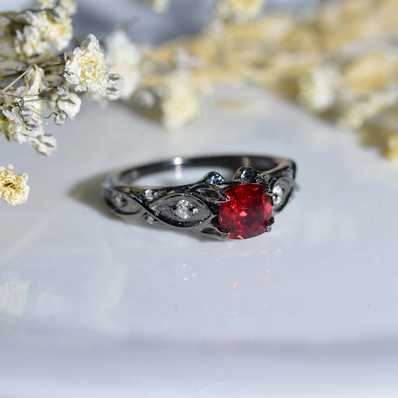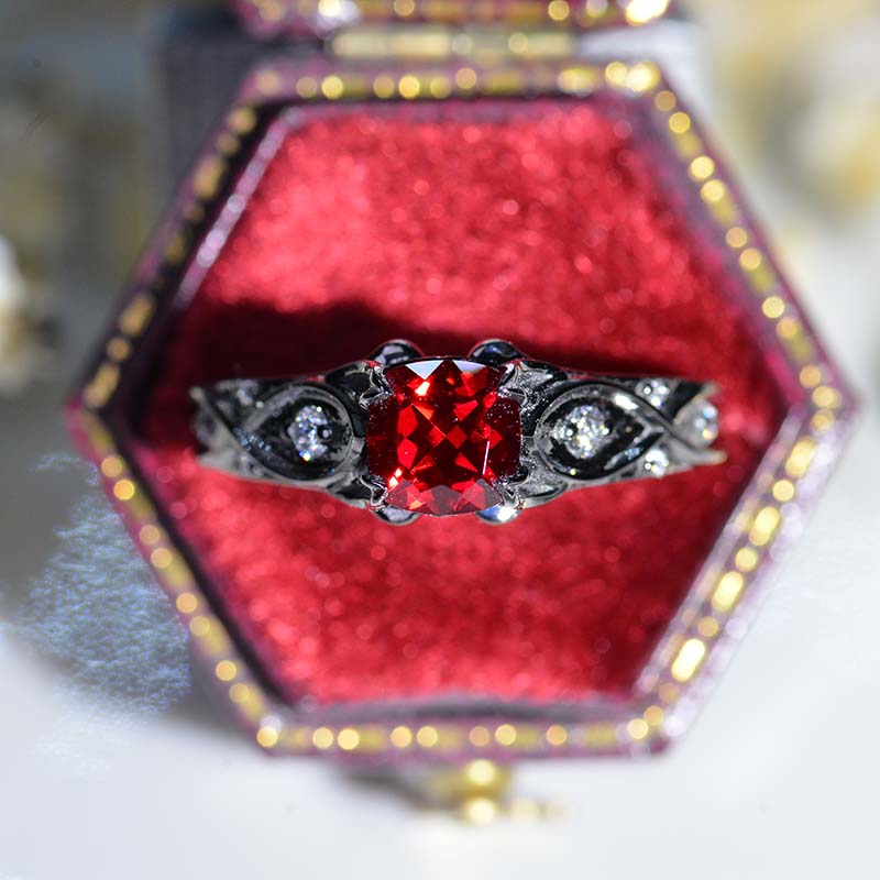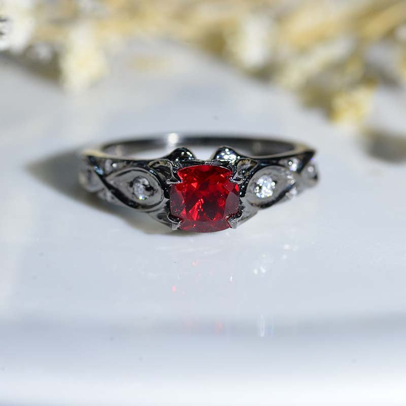 Ethically Lab-Grown Ruby Center Stone - Cushion 6x6 mm, VVS1-Clarity, Ex-Cut, Ex-Polish, VG-Symmetry) and Moissanite -Accents 0.1 CTW with 14K Black Gold or Black Platinum. Black Rhodium Plated.