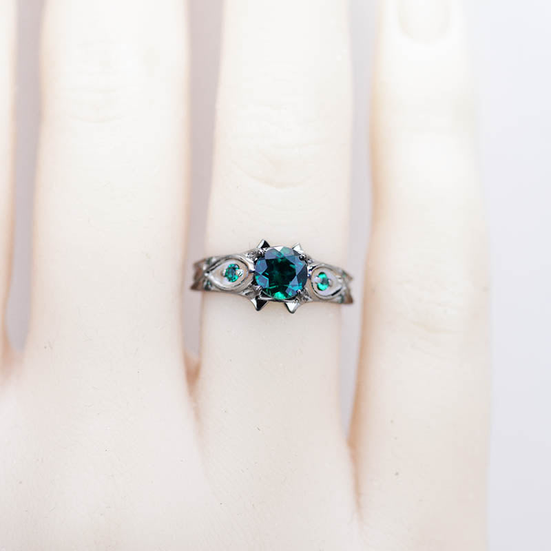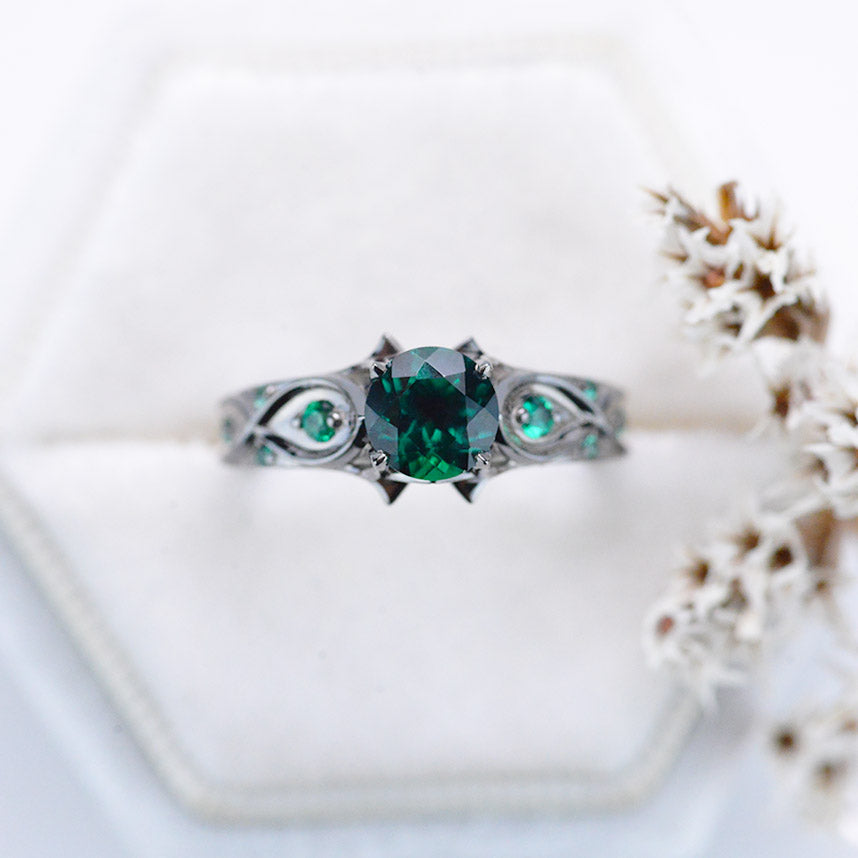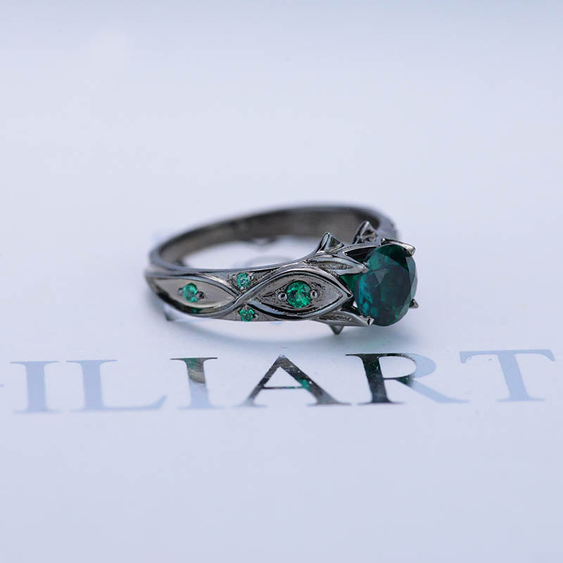 Emerald Center Stone - Round 6 mm, LAB-Grown Ex-Cut, Ex-Polish, VG-Symmetry  and 8 - Emerald Accents  0.1 CTW with 14K Black Gold.