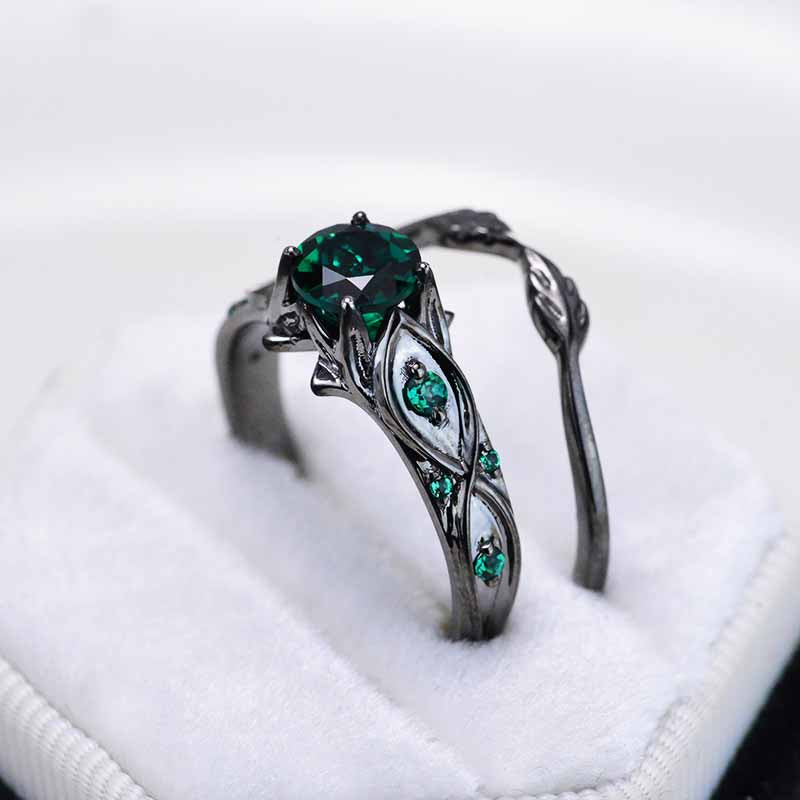 Emerald Center Stone - Round 6 mm, Ethically Lab-Grown, VVS1-Clarity, Ex-Cut, Ex-Polish, VG-Symmetry) and 8-Accents  0.1 CTW with 14K Black Gold or Black Platinum.