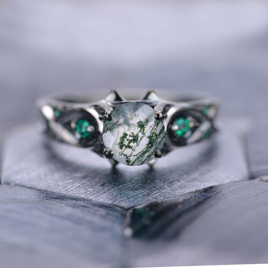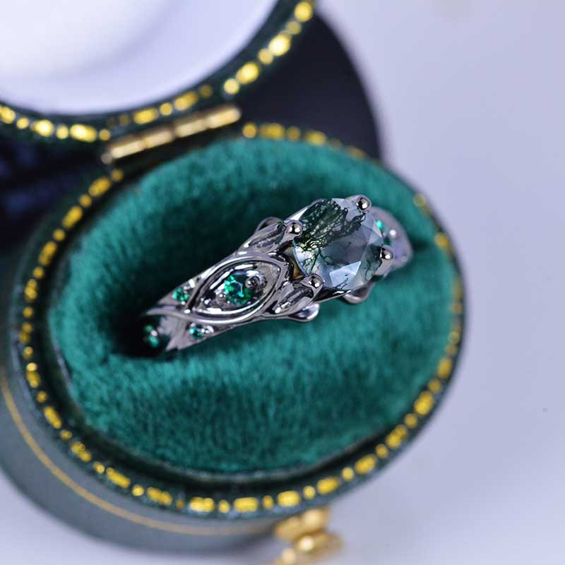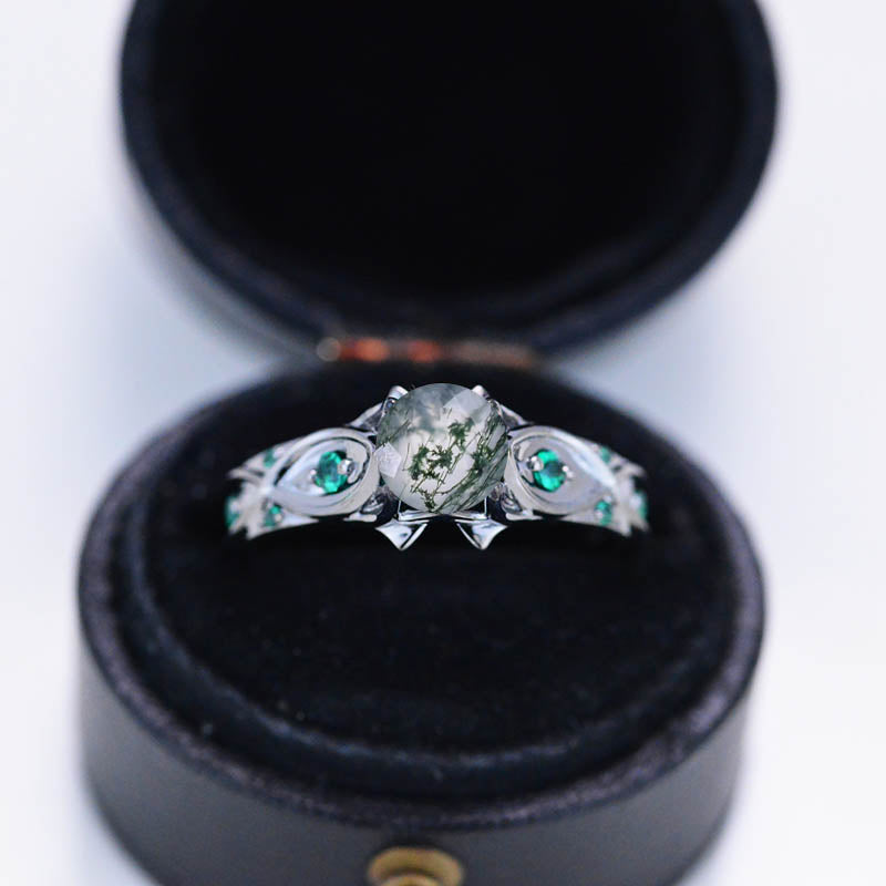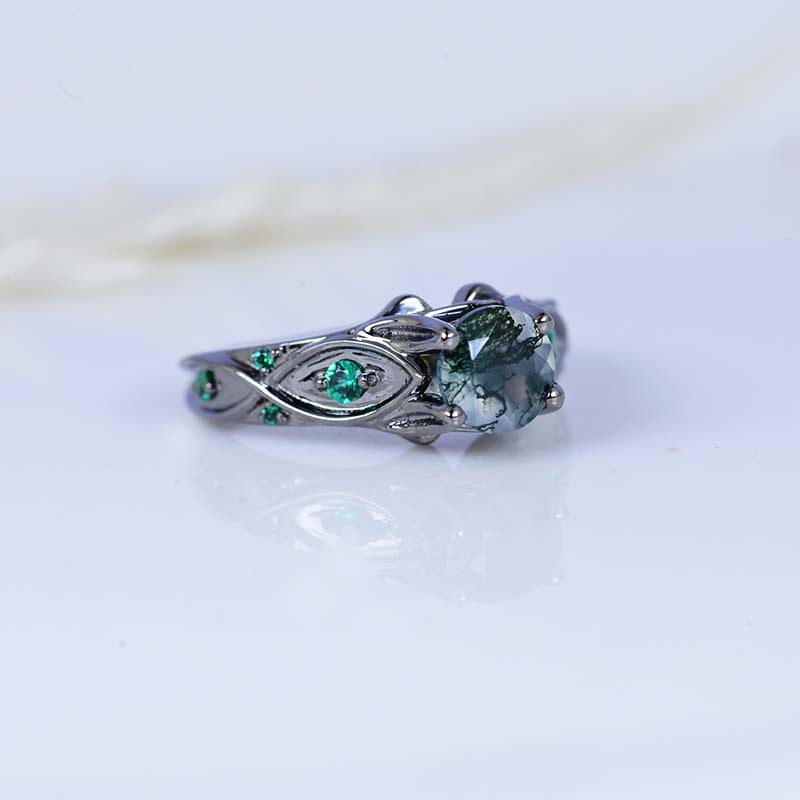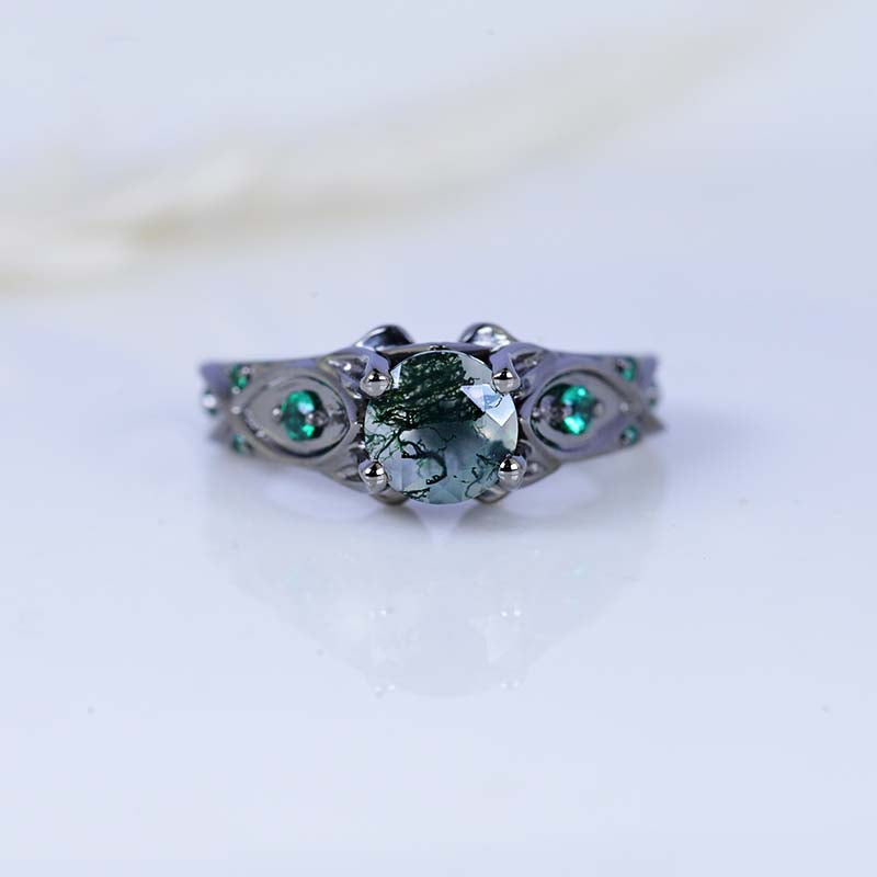 Genuine Moss Agate Center Stone - Round 6 mm, Ex-Cut, Ex-Polish, VG-Symmetry and 8- Emerald Accents 0.1 CTW with 14K Black Gold or Black Platinum. Black Rhodium Plated.