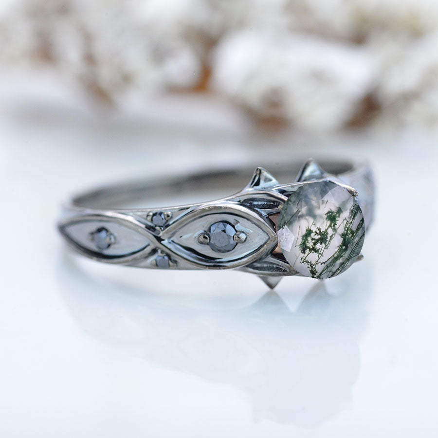 Genuine Moss Agate Center Stone - Round 6 mm, VVS1-Clarity, Ex-Cut, Ex-Polish, VG-Symmetry and 8 - Black Moissanite Accents 0.1 CTW with 14K Black Gold or Black Platinum.
