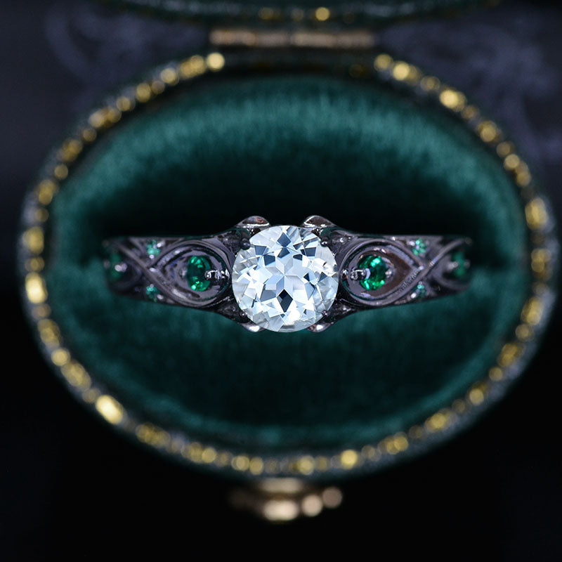 Genuine Natural Aquamarine Center Stone - Round 6 mm, Ex-Cut, Ex-Polish, VG-Symmetry) and 8-Accents 0.1 CTW with 14K Black Gold or Black Platinum. Black Rhodium Plated.