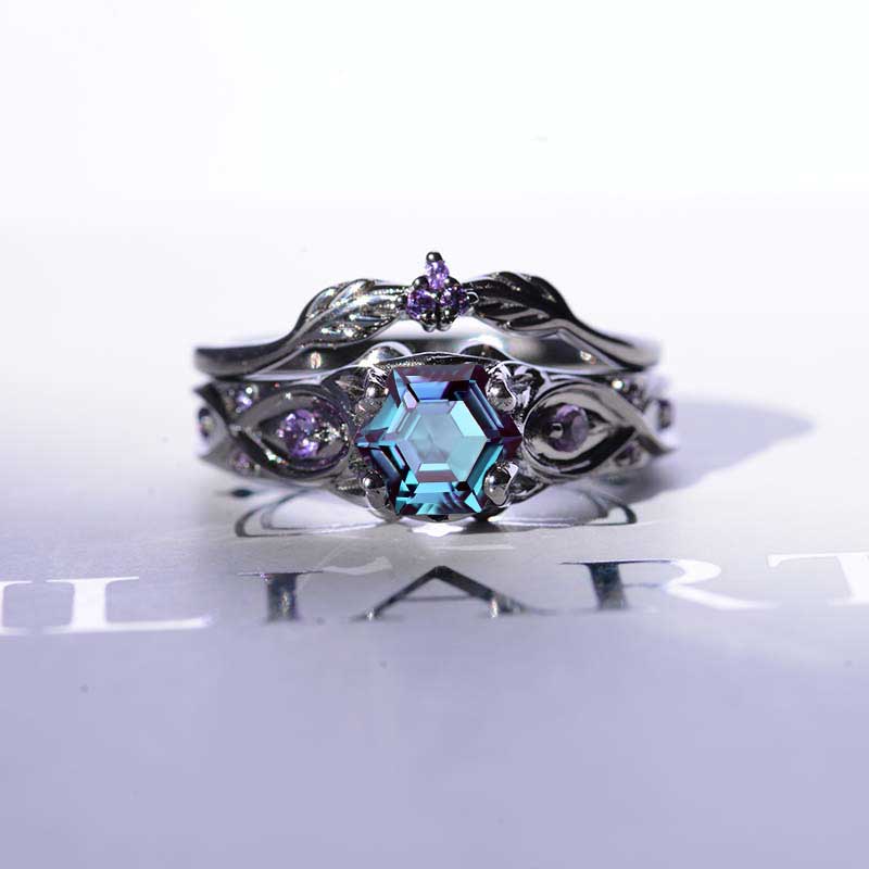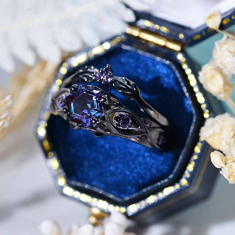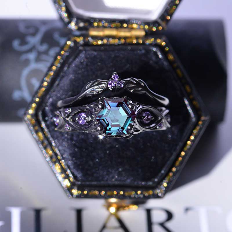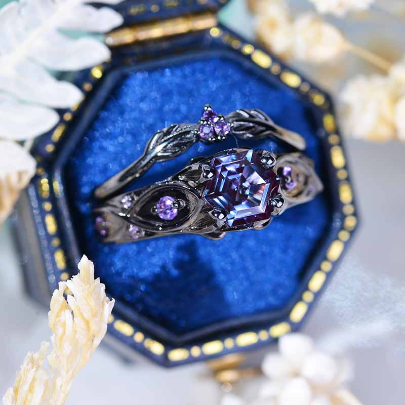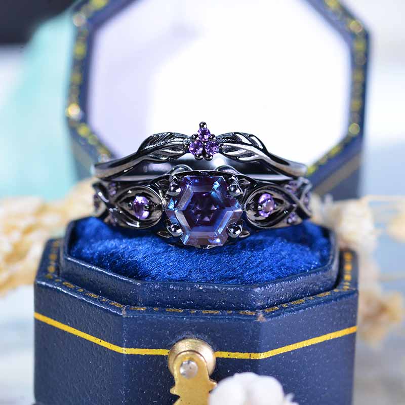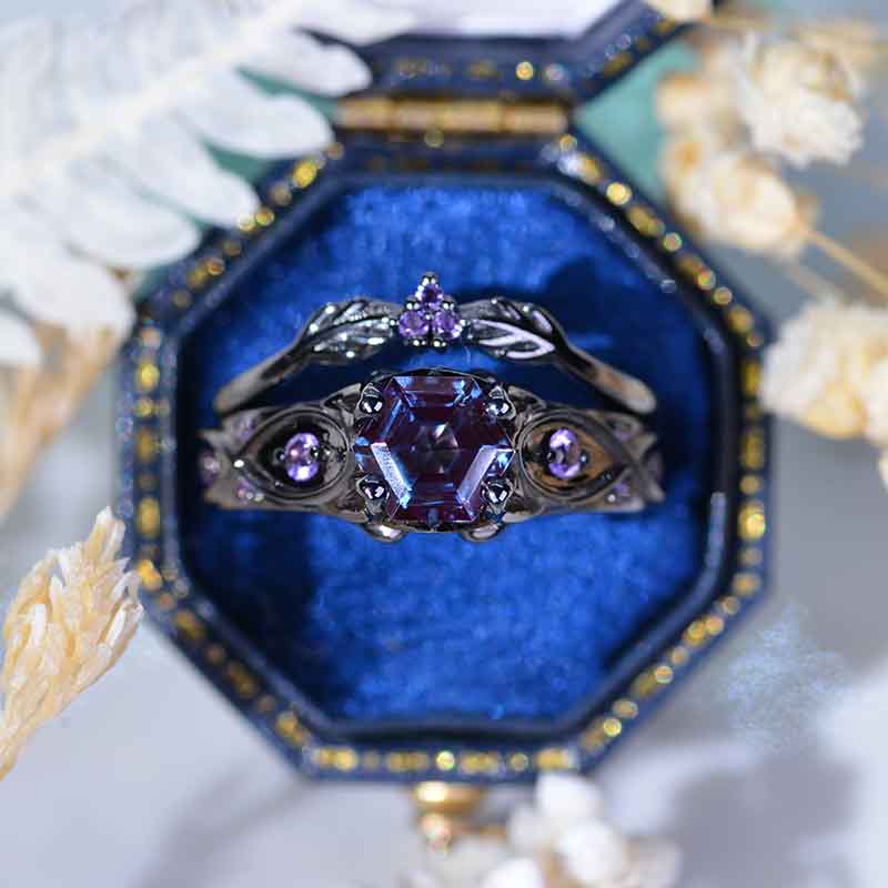 14K Black Rhodium Gold Hexagon Alexandrite Celtic Amethyst Engagement Ring Set