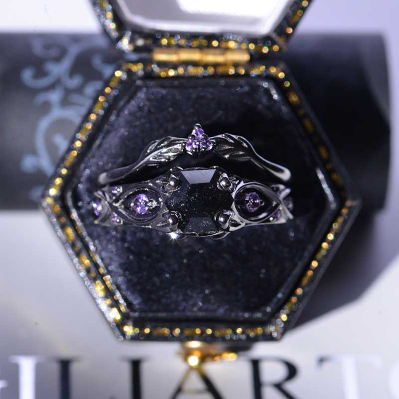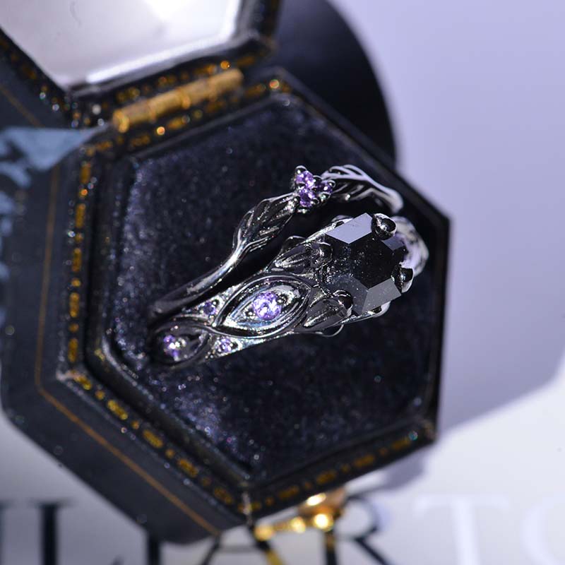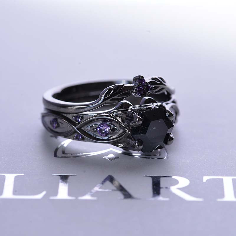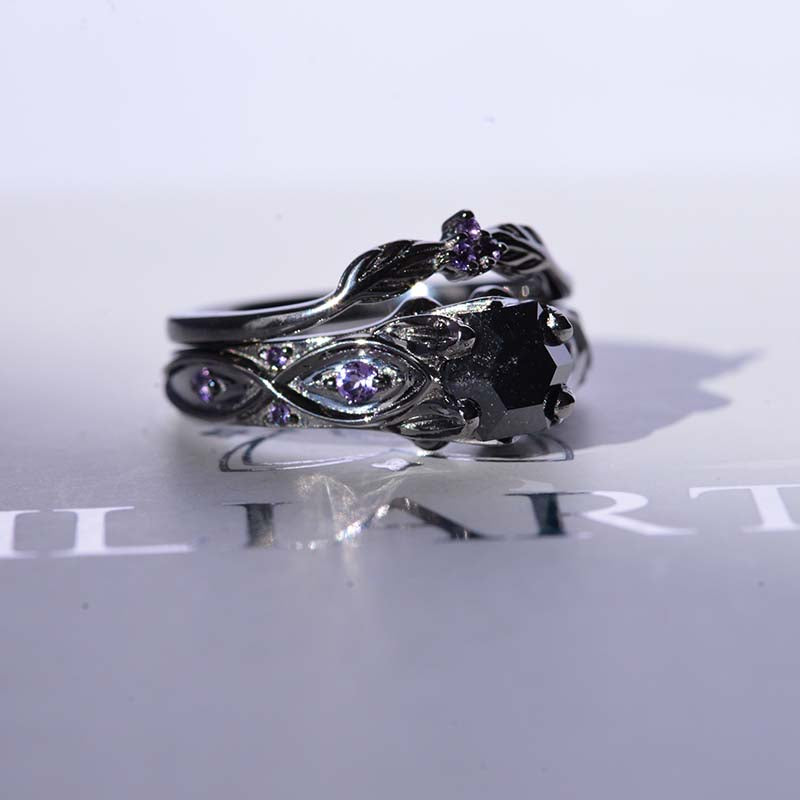 14K Black Gold Hexagon Black Moissanite Celtic Amethyst Engagement Ring Set