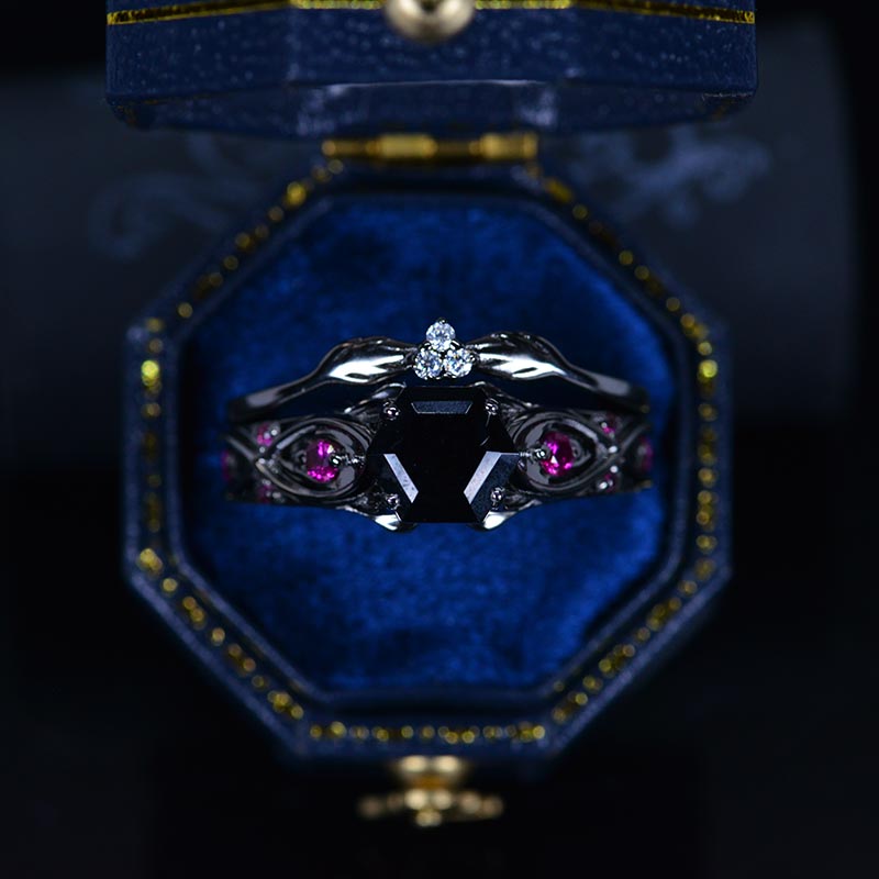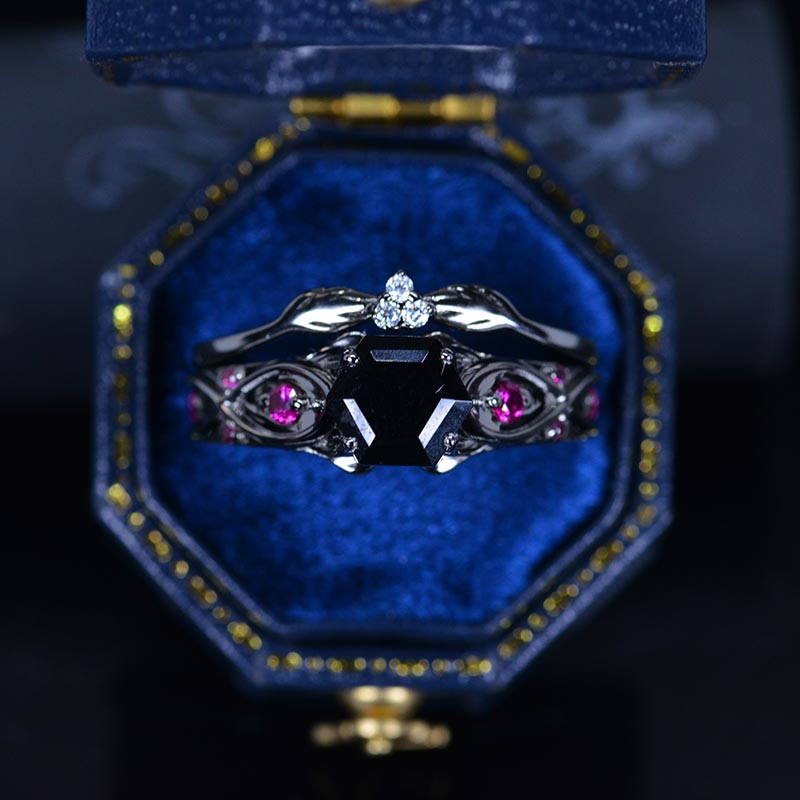 Black Moissanite Center Stone - Hexagon 6 mm, Ex-Cut, Ex-Polish, VG-Symmetry and Ruby Accents  0.1 CTW with 14K Black Gold or Black Platinum. Black Rhodium Plated.