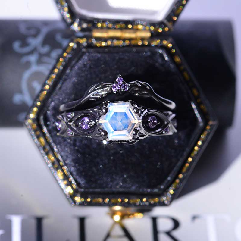 14K Black Gold Hexagon Black Natural Moonstone Celtic Amethyst Engagement Ring Set