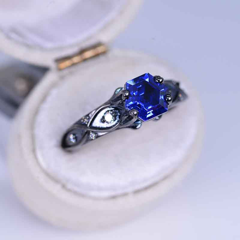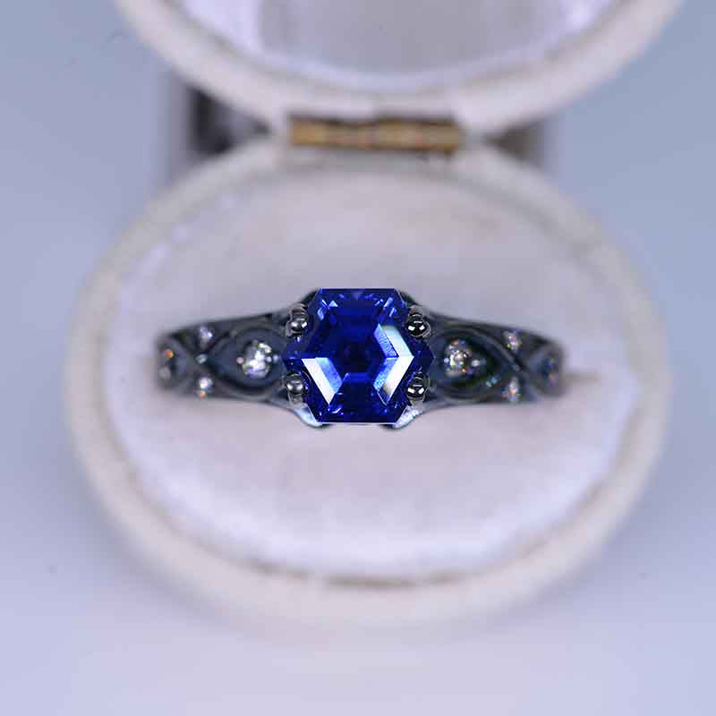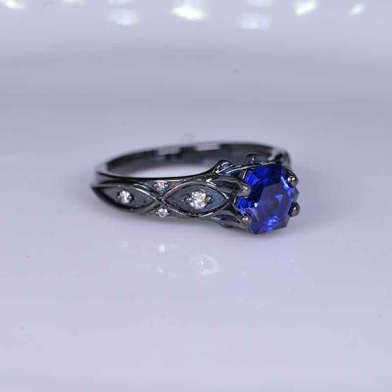 Ethically Lab-Grown Blue Sapphire Center Stone - Hexagon 7x6 mm, Ex-Cut, Ex-Polish, VG-Symmetry and Blue Sapphire  0.1 CTW with 14K Black Gold or Black Platinum.