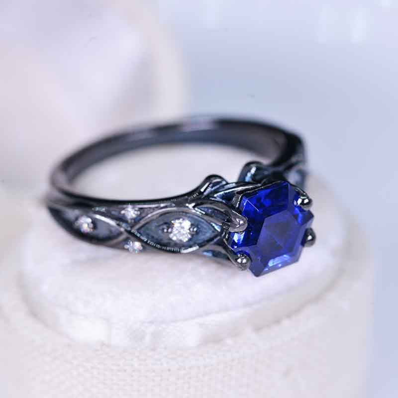 14K Black Rhodium Gold Hexagon Black Royal Blue Sapphire Celtic Engage - Giliarto