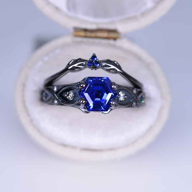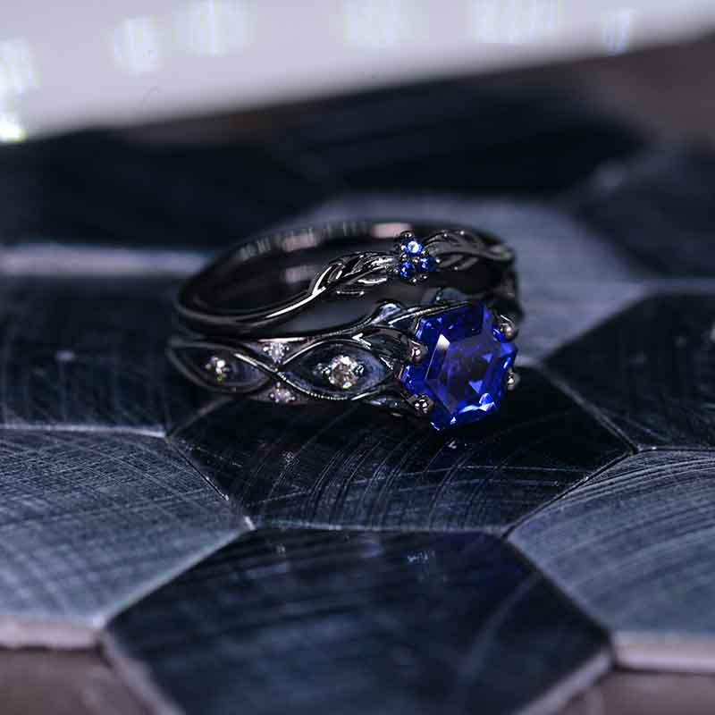 14K Black Rhodium Gold Hexagon Black Royal Blue Sapphire Celtic Engagement Ring Set