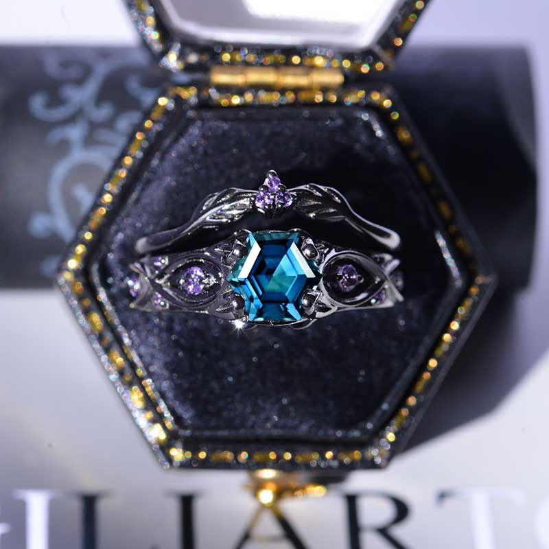 14K Black Gold Hexagon Cornflower Sapphire Celtic Amethyst Engagement Ring Set