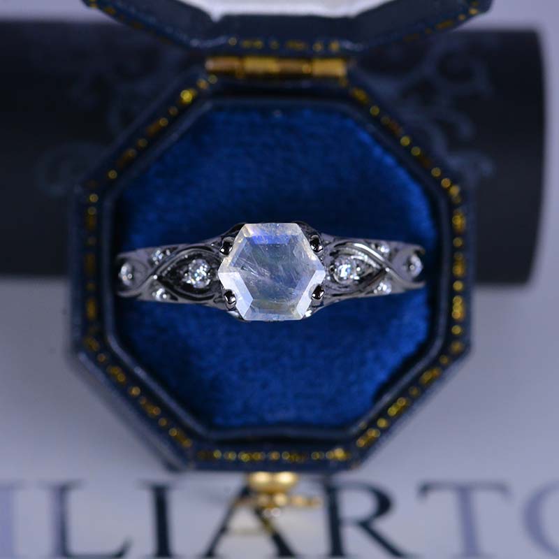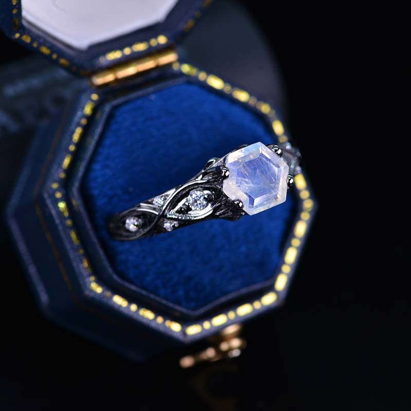 Genuine Moonstone Center Stone - Hexagon 6mm, Ex-Cut, Ex-Polish, VG-Symmetry and 8 D-Colorless Moissanite Accents  0.1 CTW with 14K Black Gold or Black Platinum. Black Rhodium.