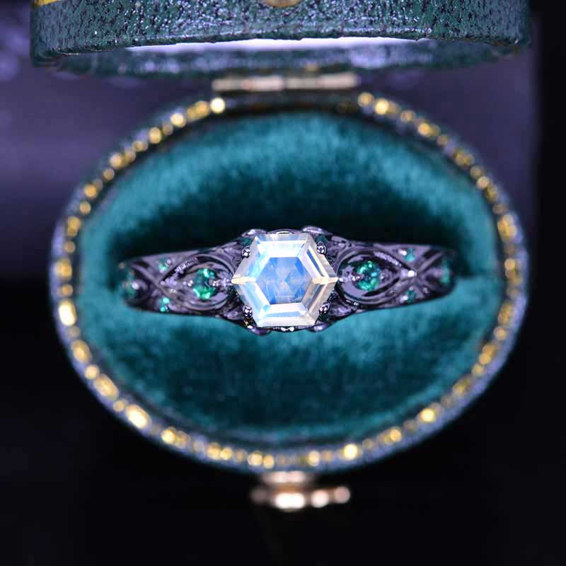 14K Black Gold Hexagonal Natural Moonstone Celtic Engagement Ring