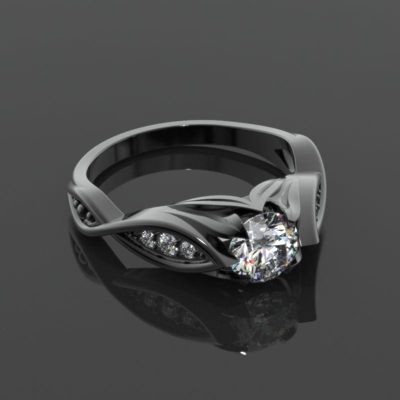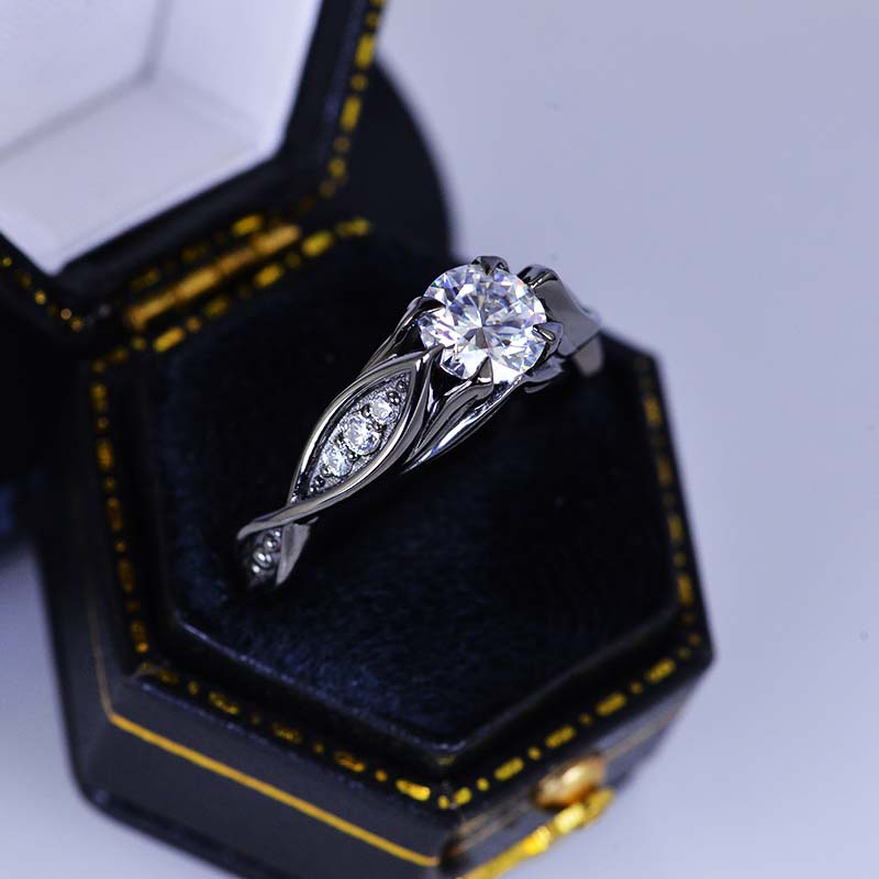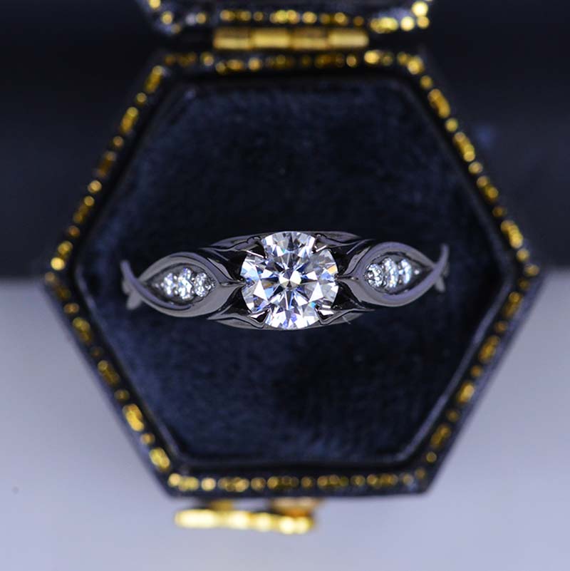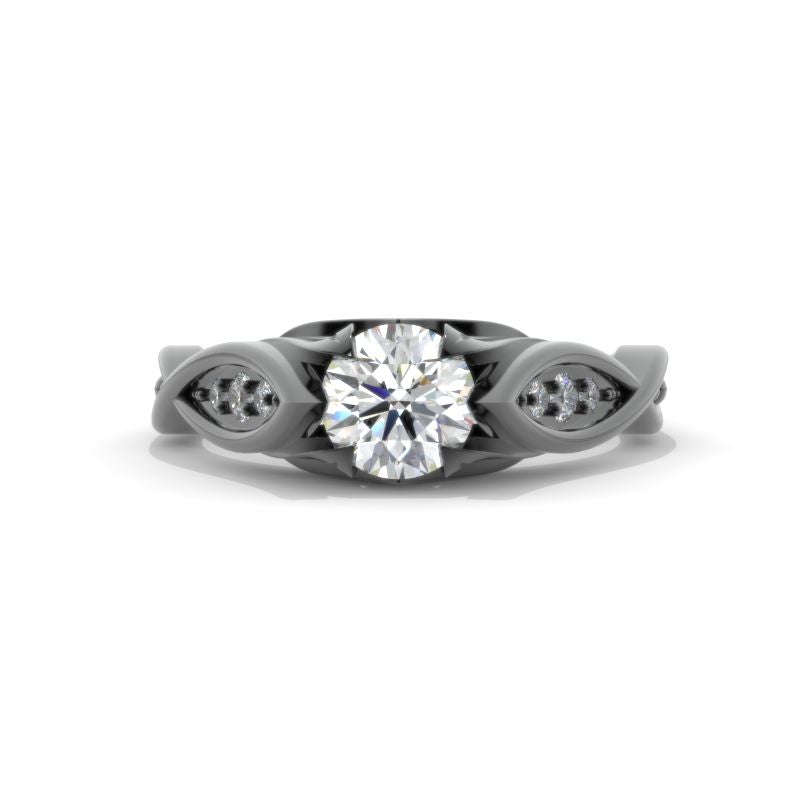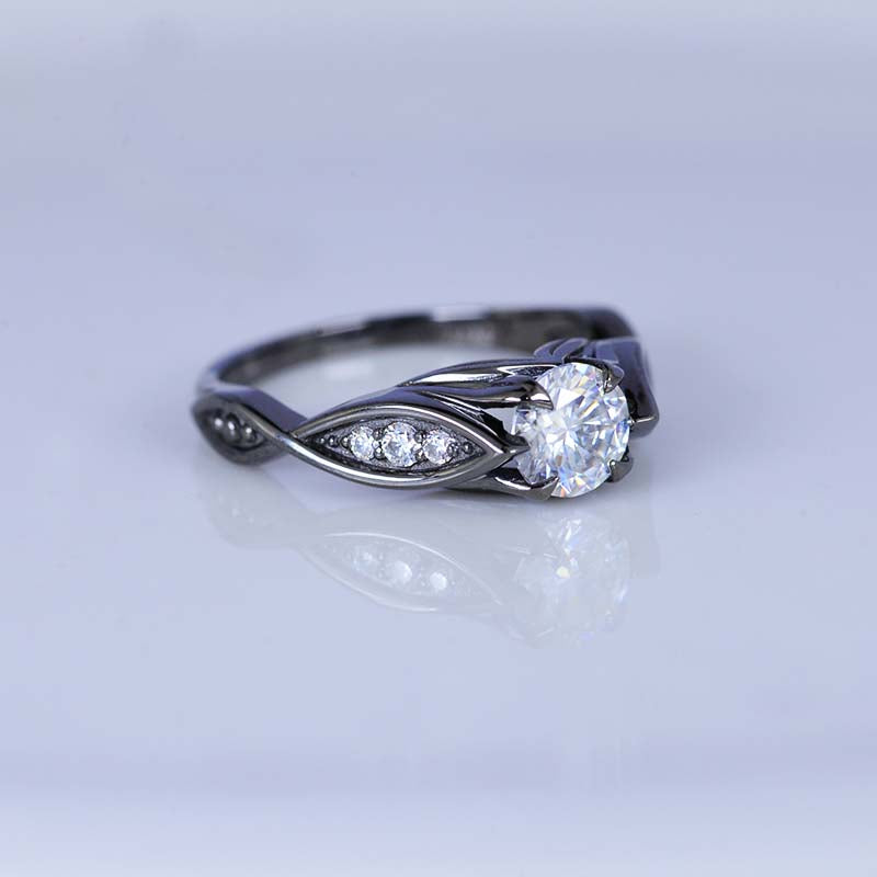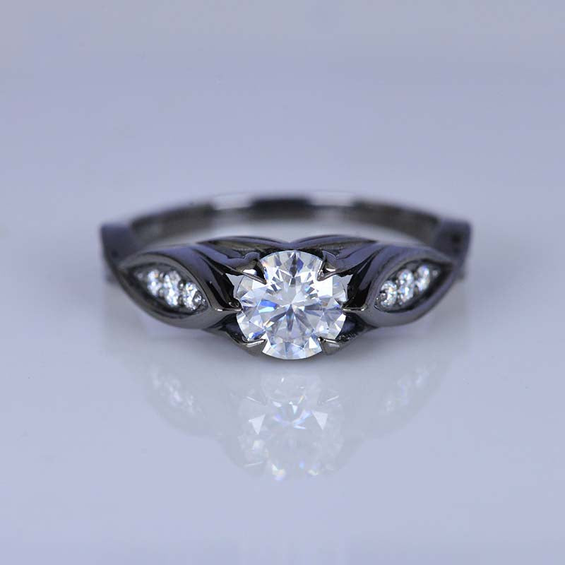 Moissanite Center Stone-Round 6mm, D-Colorless, VVS1-Clarity, Ex-Cut, Ex-Polish, VG-Symmetry) and 8-Moissanite Accents  0.1 CTW with 14K Black Gold or Black Platinum.