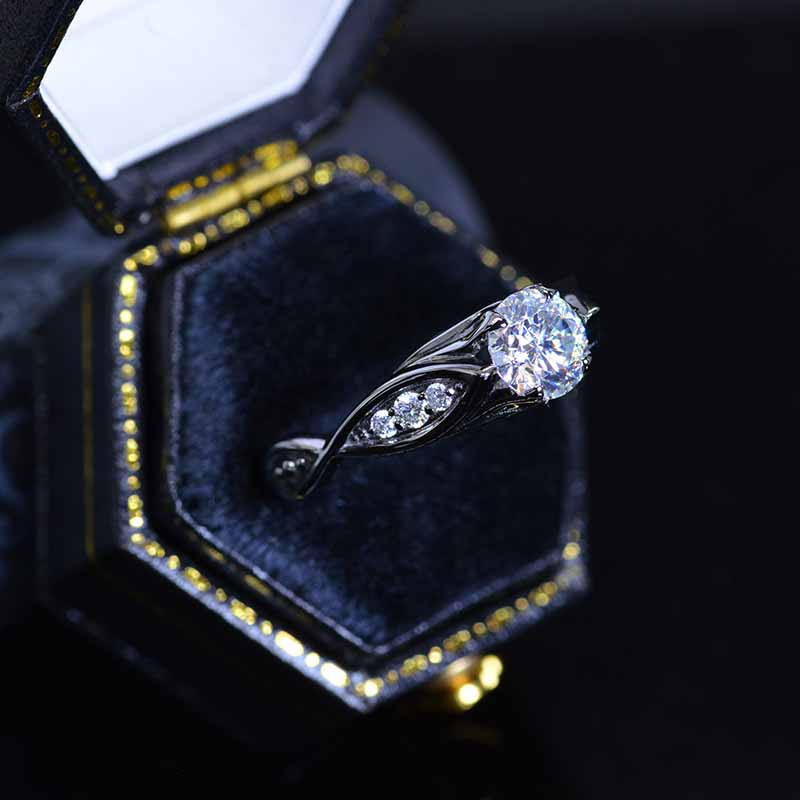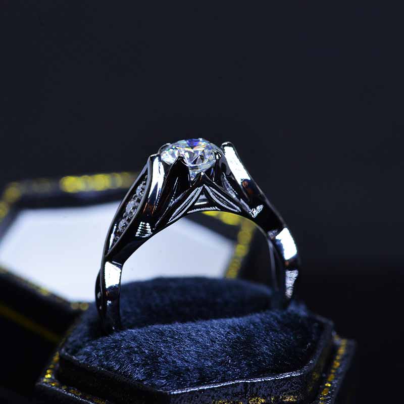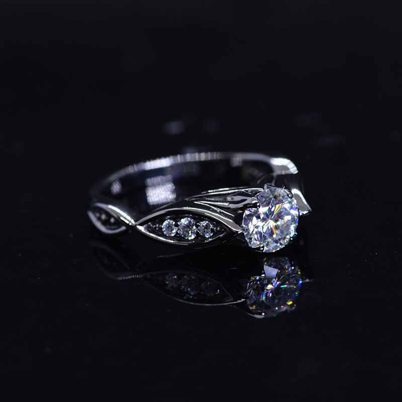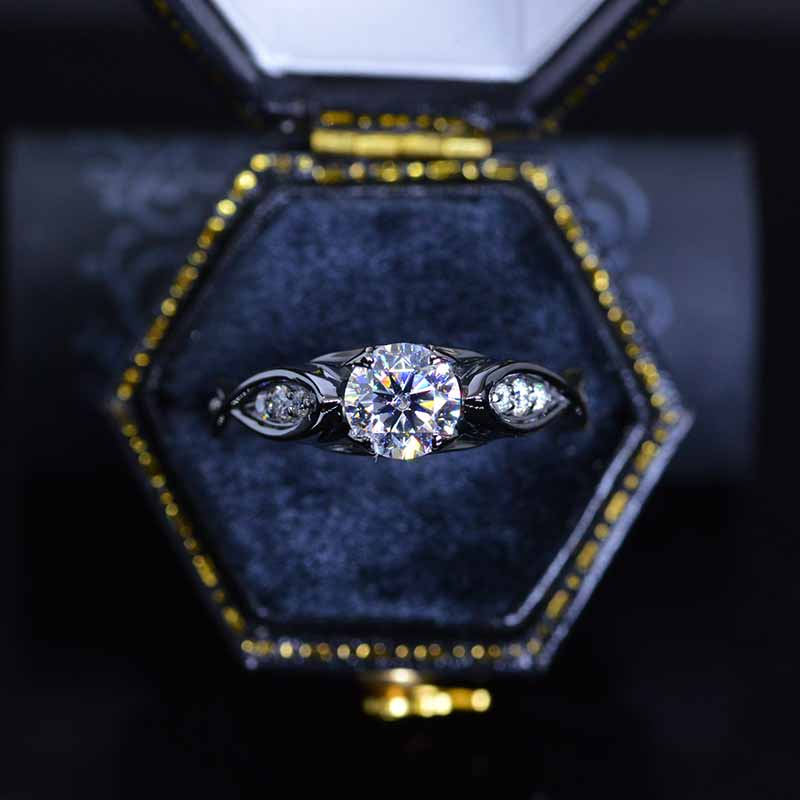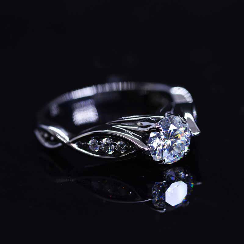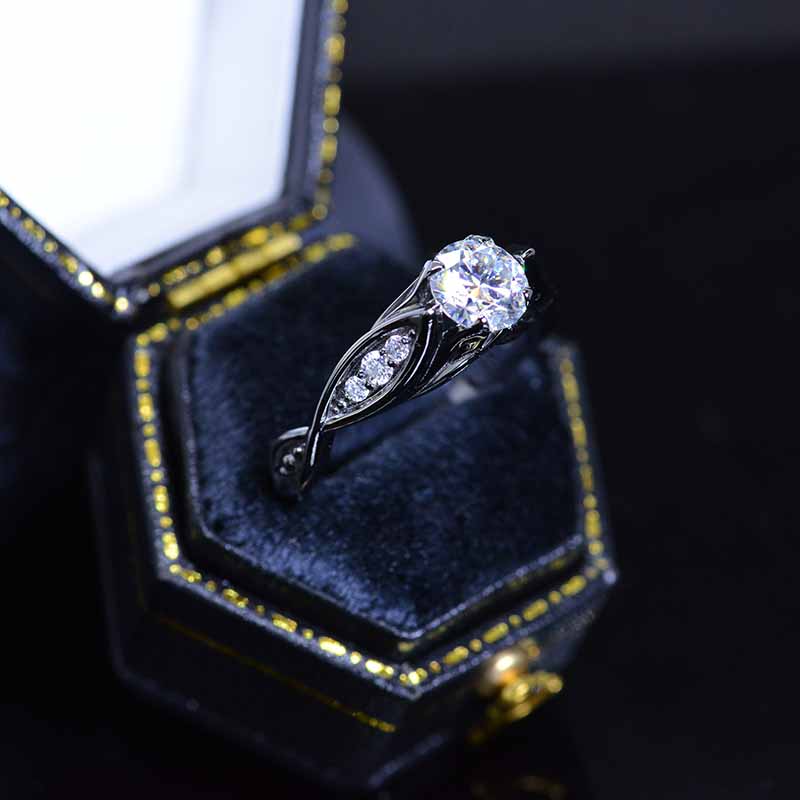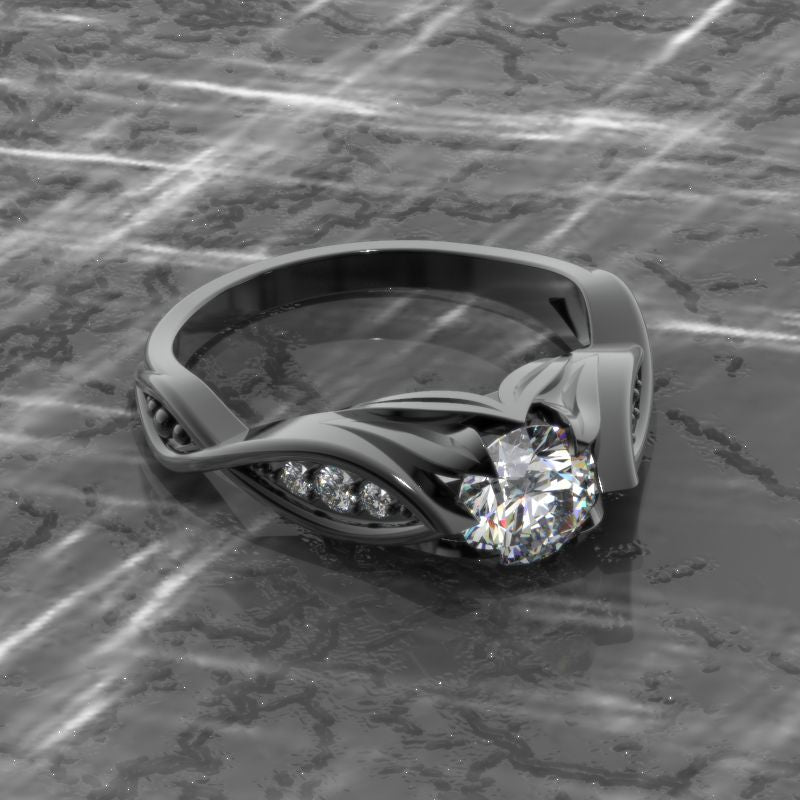 Moissanite Center Stone-Round 6mm, D-Colorless, VVS1-Clarity, Ex-Cut, Ex-Polish, VG-Symmetry) and 8-Moissanite Accents  0.1 CTW with 14K Black Gold or Black Platinum.