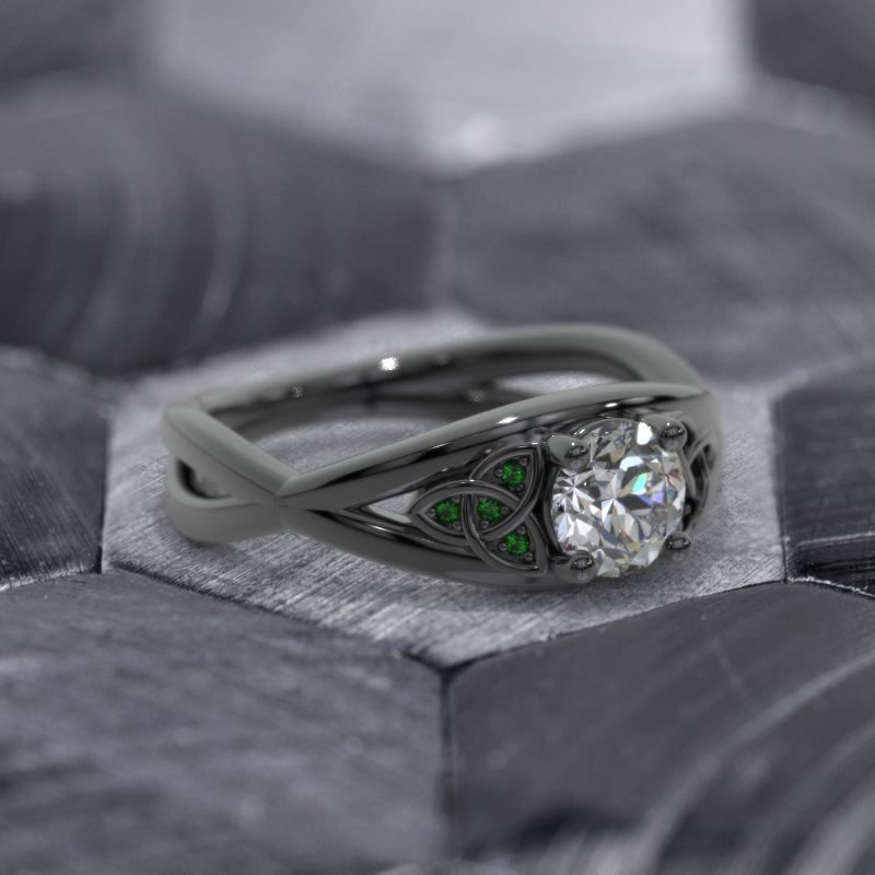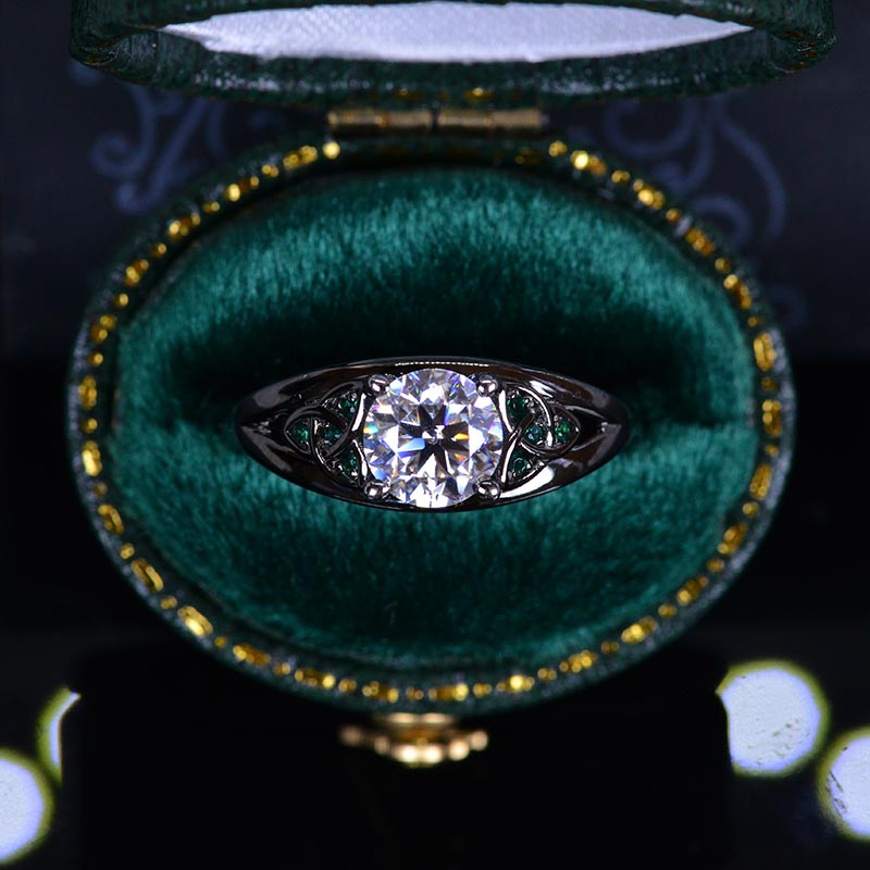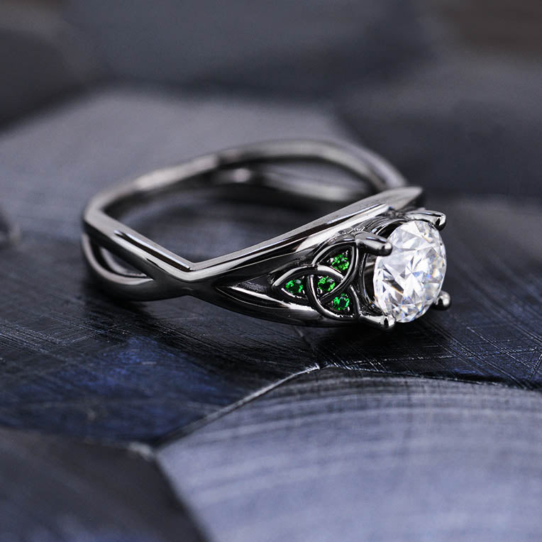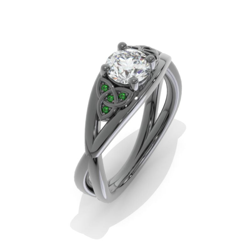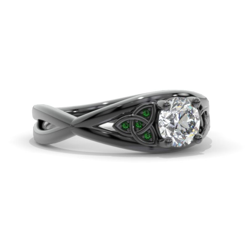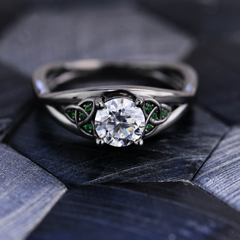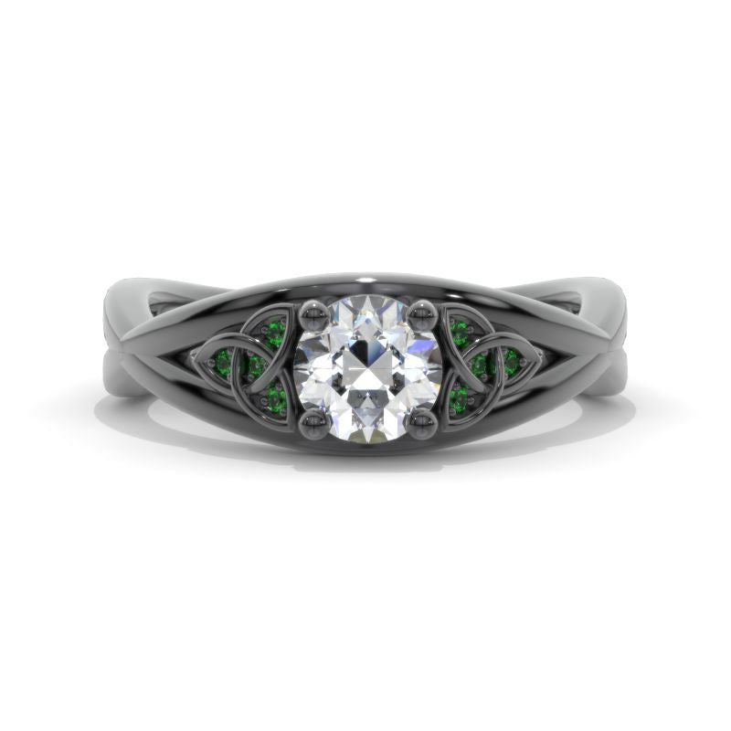 Moissanite Center Stone - Round 6mm, D-Colorless, VVS1-Clarity, Ex-Cut, Ex-Polish, VG-Symmetry and 8 Emerald Accents 0.1 CTW with 14K Black Gold or Black Platinum. Black Rhodium.
