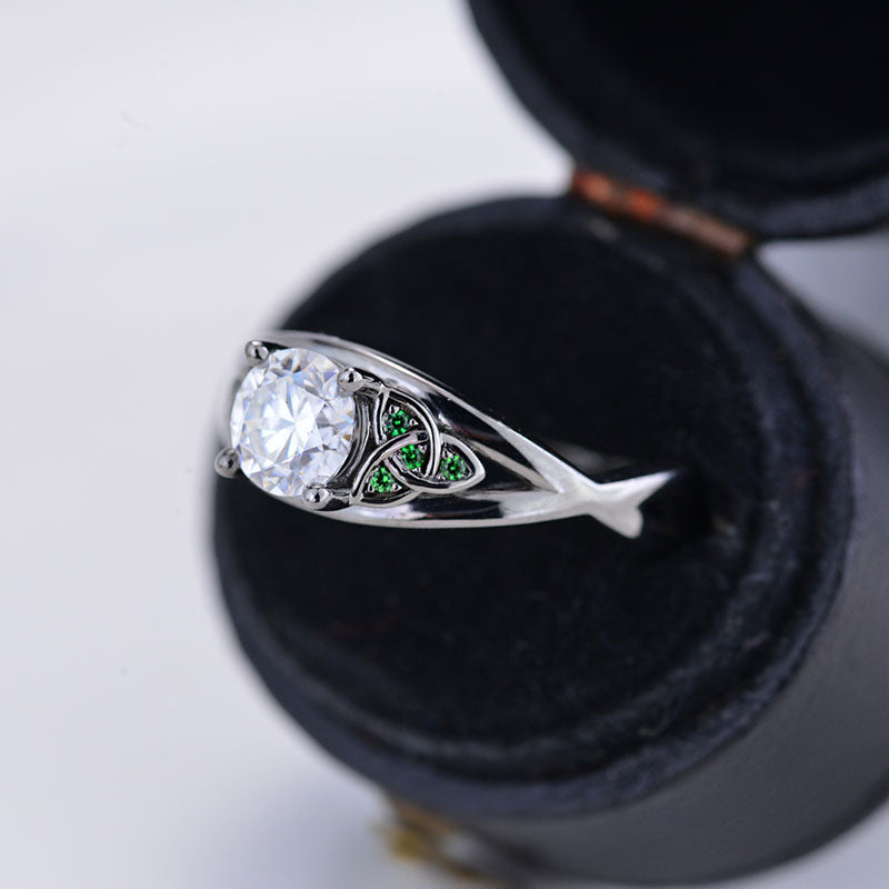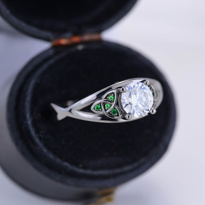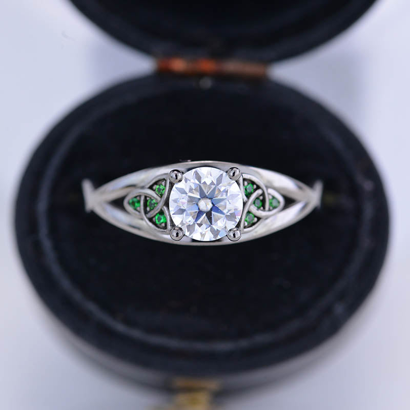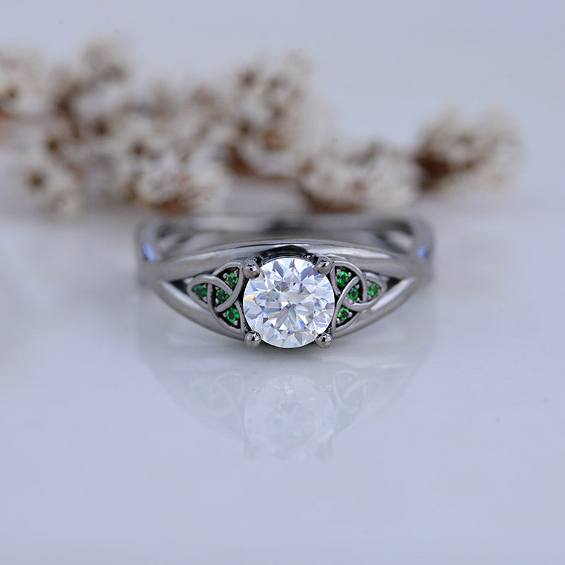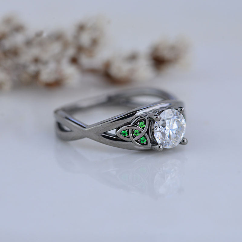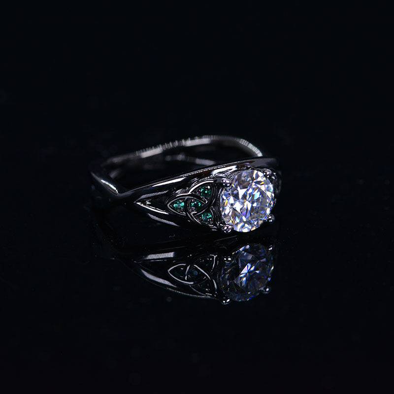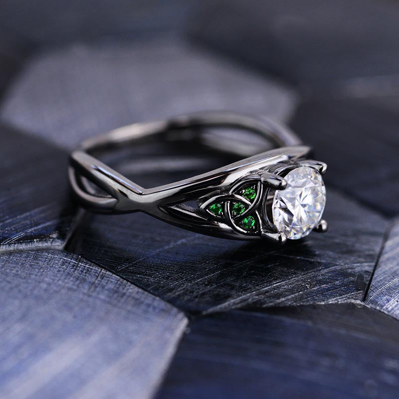 Moissanite Center Stone - Round 6mm, D-Colorless, VVS1-Clarity, Ex-Cut, Ex-Polish, VG-Symmetry and 8 Emerald Accents 0.1 CTW with 14K Black Gold or Black Platinum. Black Rhodium.