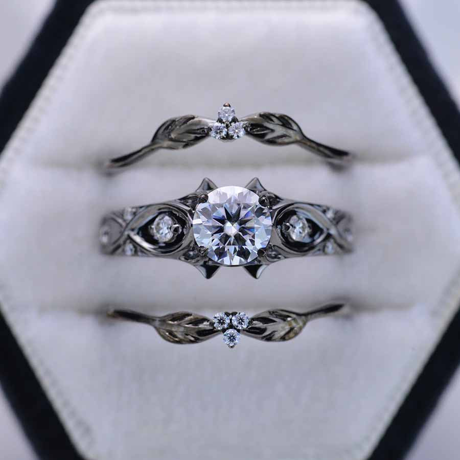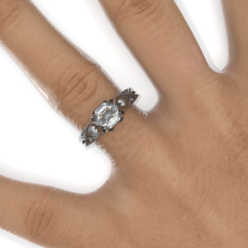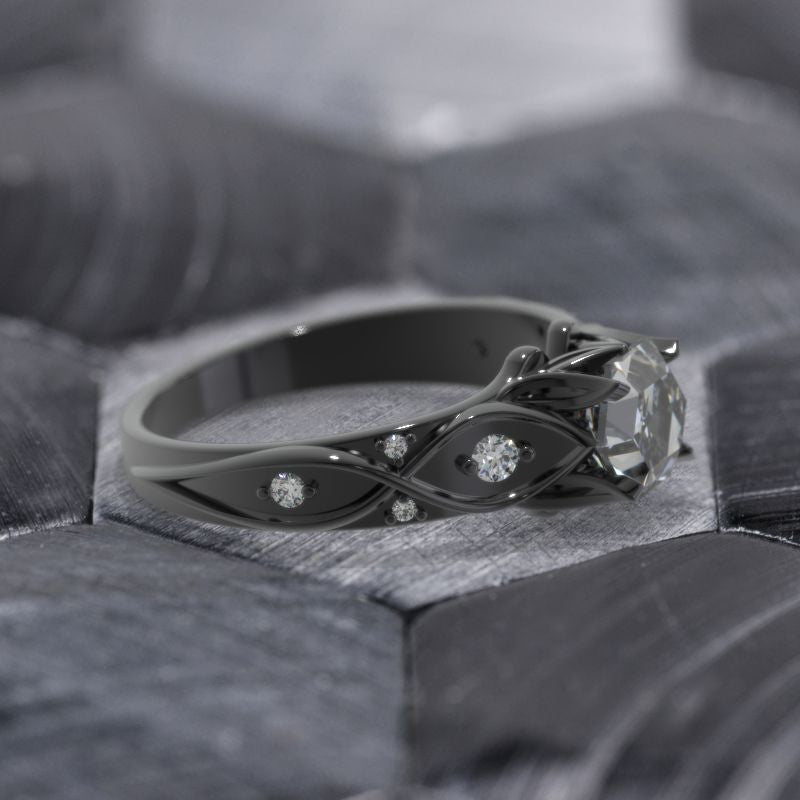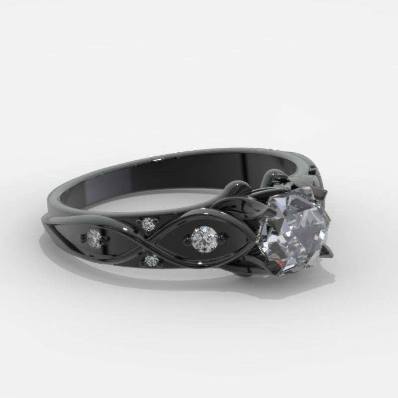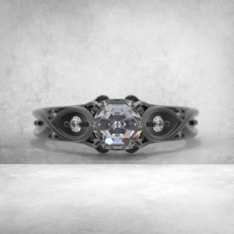 Moissanite Center Stone - Hexagon 6mm, D-Colorless, VVS1-Clarity, Ex-Cut, Ex-Polish, VG-Symmetry and 8 D-Colorless Accents 0.1 CTW with 14K Black Gold or Black Platinum. Black Rhodium.