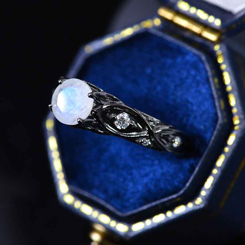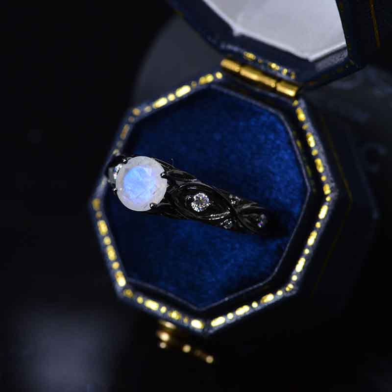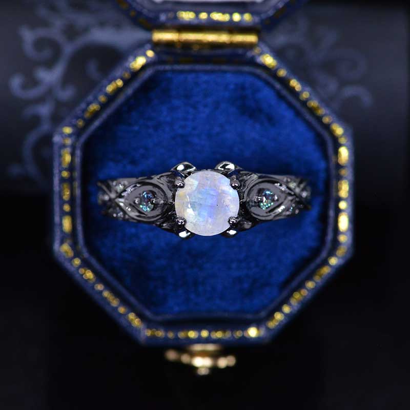 Moonstone Center Stone - Round 6 mm, Genuine, VVS1-Clarity, Ex-Cut, Ex-Polish, VG-Symmetry) and 8- Moissanites Accents  0.1 CTW with 14K Black Gold or Black Platinum. Black Rhodium Plated.