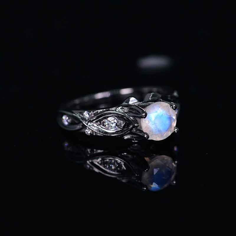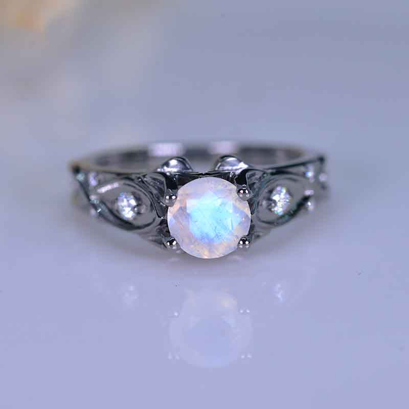 Natural Moonstone Center Stone - Round 6mm, Ex-Cut, Ex-Polish, VG-Symmetry and 8 D-Colorless Accents  0.1 CTW with 14K Black Gold or Black Platinum. Black Rhodium Plated.