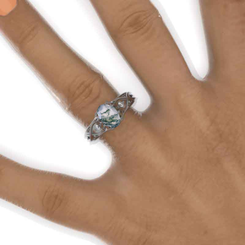 Genuine Moss Agate Center Stone - Oval 8x6mm Ex-Cut, Ex-Polish, VG-Symmetry and 8 Moissanite D-Colorless Accents  0.1 CTW with 14K Black Gold or Black Platinum. Black Rhodium Plated.